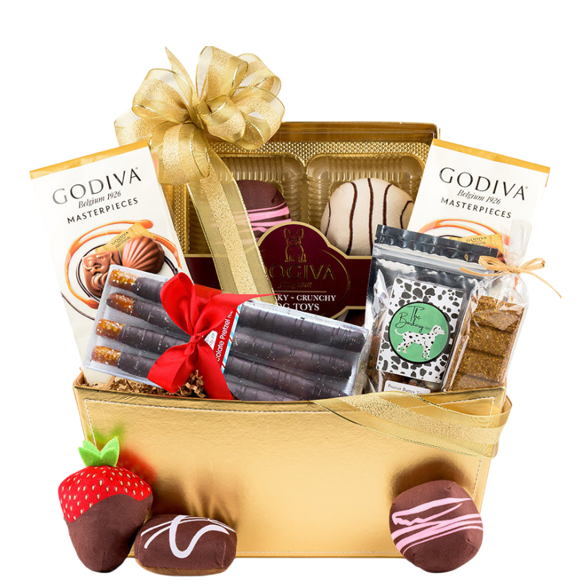 Send an indulgent gift to the chocolate lover in your life with our Bark Avenue Celebration! Gourmet Dog & Owner Gift. This sweet treat is designed to bring joy to both the dog and their owner! For the humans, relish the delightful combination of chocolate pretzel rods and assorted chocolates. Meanwhile, your furry friend will adore the chocolate plush toys and organic dog treats that promise tail-wagging happiness.