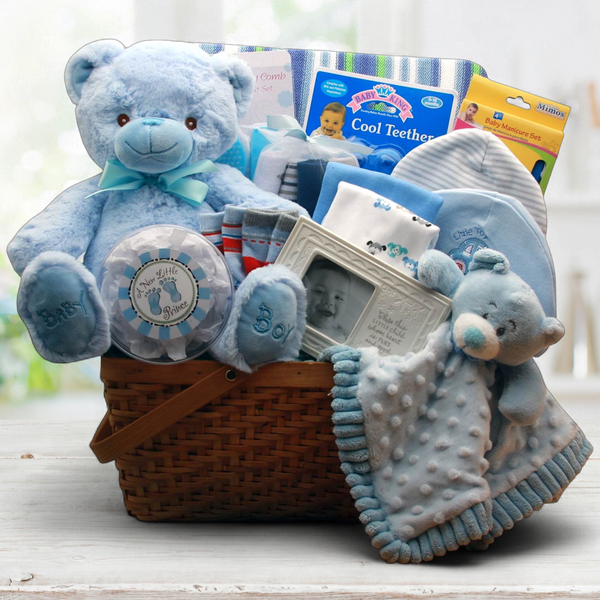 Our best selling Bear Hugs Baby Gift Basket arrives in an attractive hamper with baby necessities like baby booties, ultra soft blanket, footprint kit and much more. The adorable keepsake plush blue bear is designed with embroidered details, delicate satin accents and a sweet decorative bow.