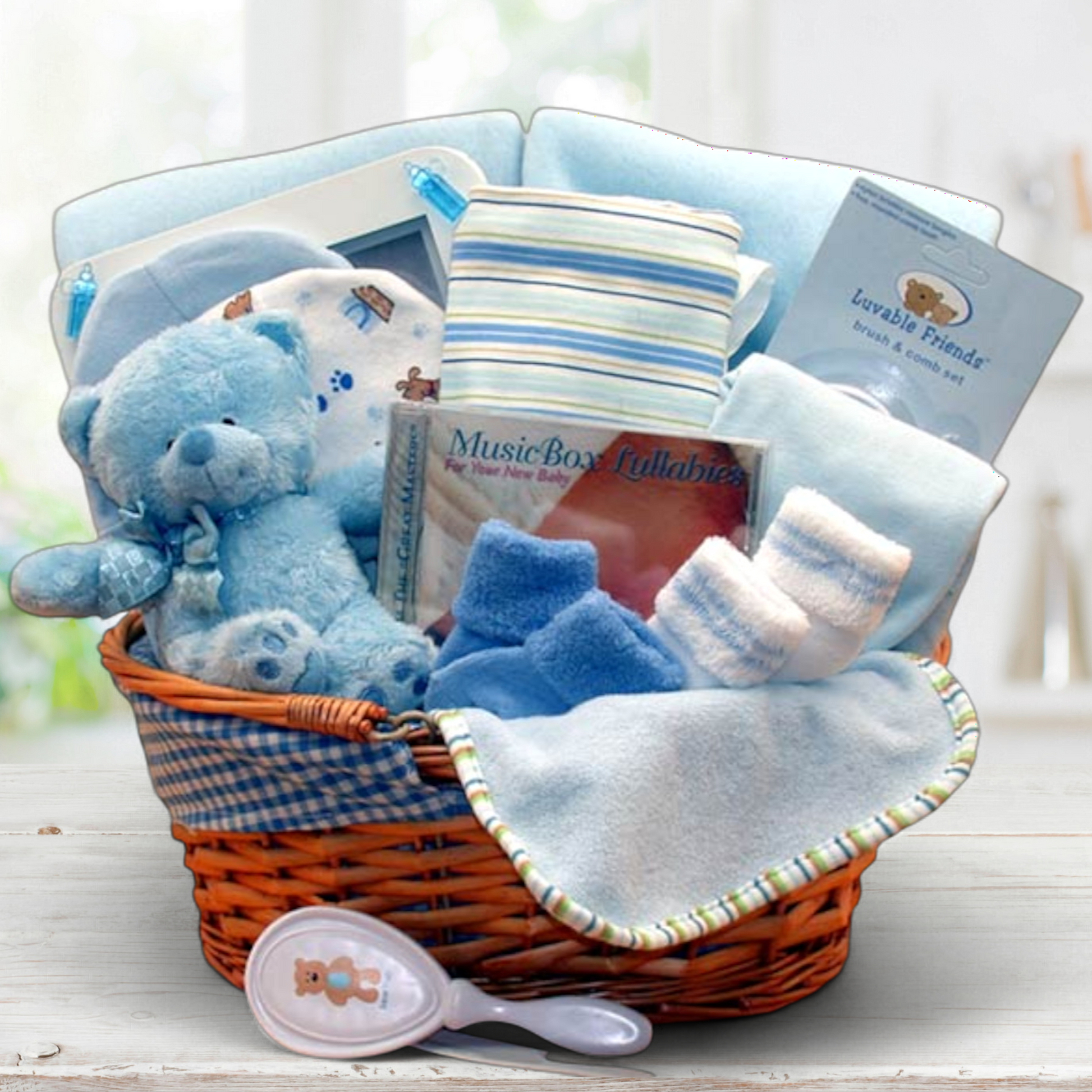 The Beary Special New Baby Gift Basket celebrates the arrival of a beautiful baby with an over flowing, deluxe fabric lined hamper. This cute baby gift is filled to the brim with a collection of select baby necessities any new parent will love!