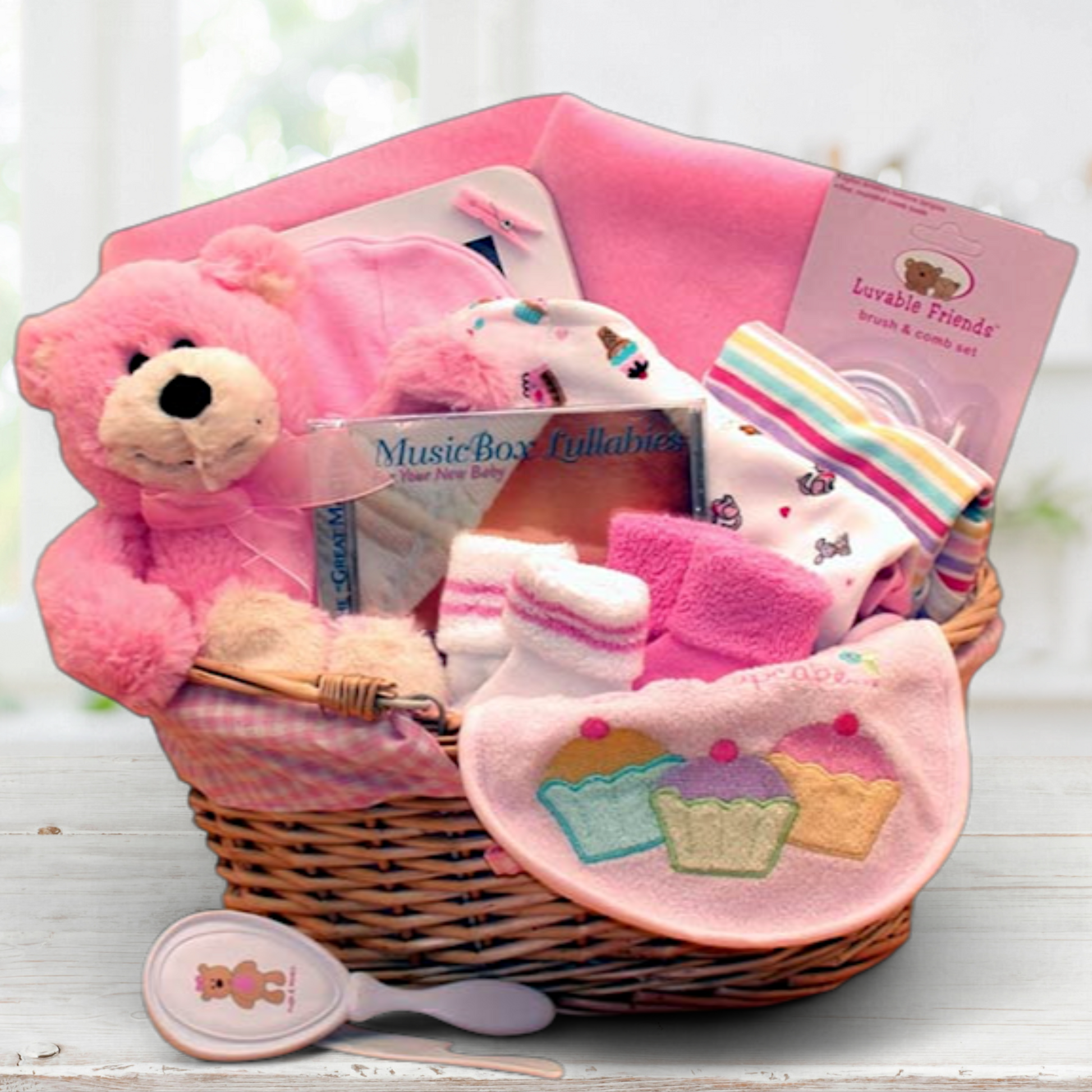 The Beary Special New Baby Gift Basket celebrates the arrival of a beautiful baby with an over flowing, deluxe fabric lined hamper. This cute baby gift is filled to the brim with a collection of select baby necessities any new parent will love!