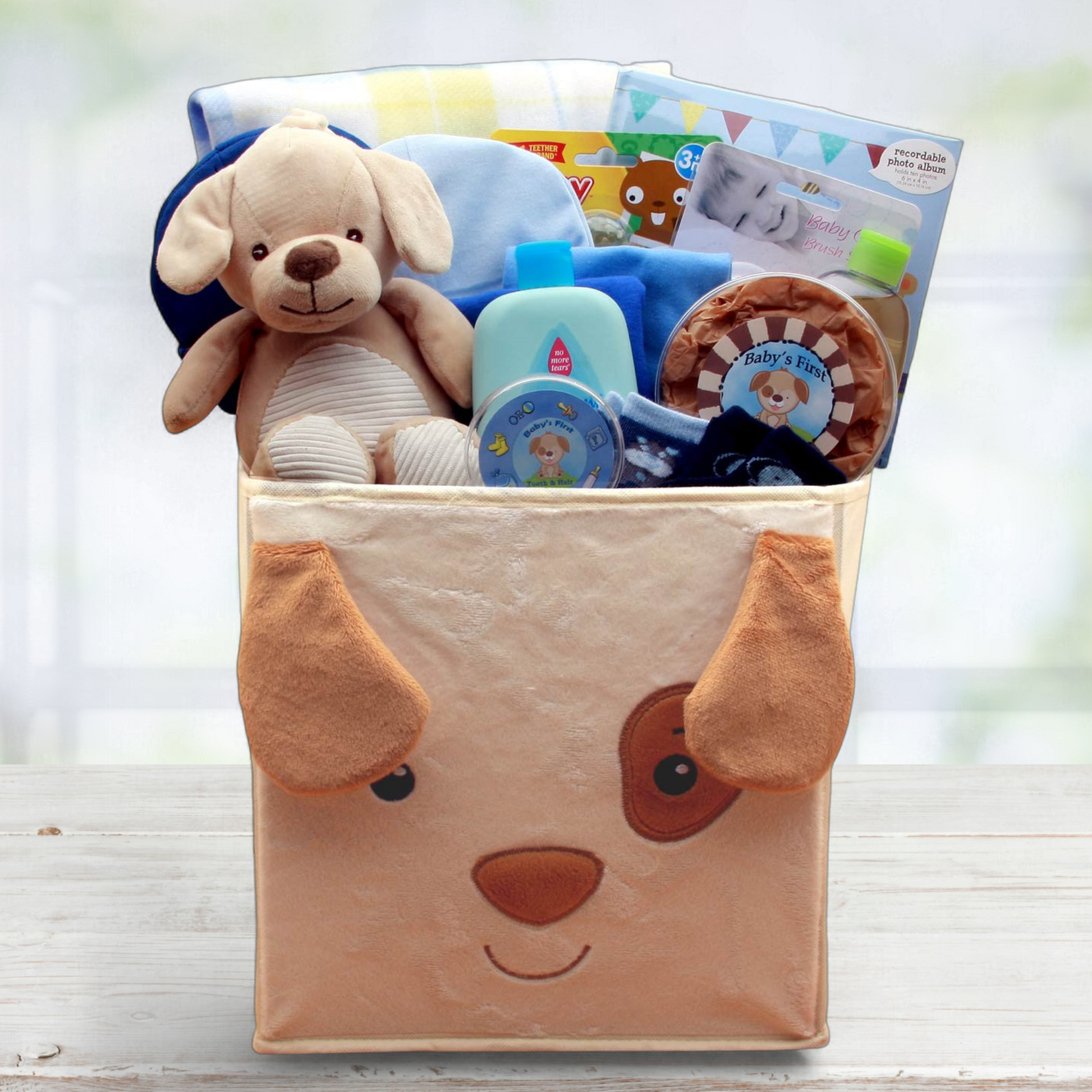 Welcome the new little bundle home with our adorable Best Friends Baby Gift Basket. The ultra plush puppy will soon become the new little bundles most treasured friend. He even has a stroller hook so he'll never be lost. We've used a collapsible puppy storage bin as the container to hold all his favorite toys as the years go by.