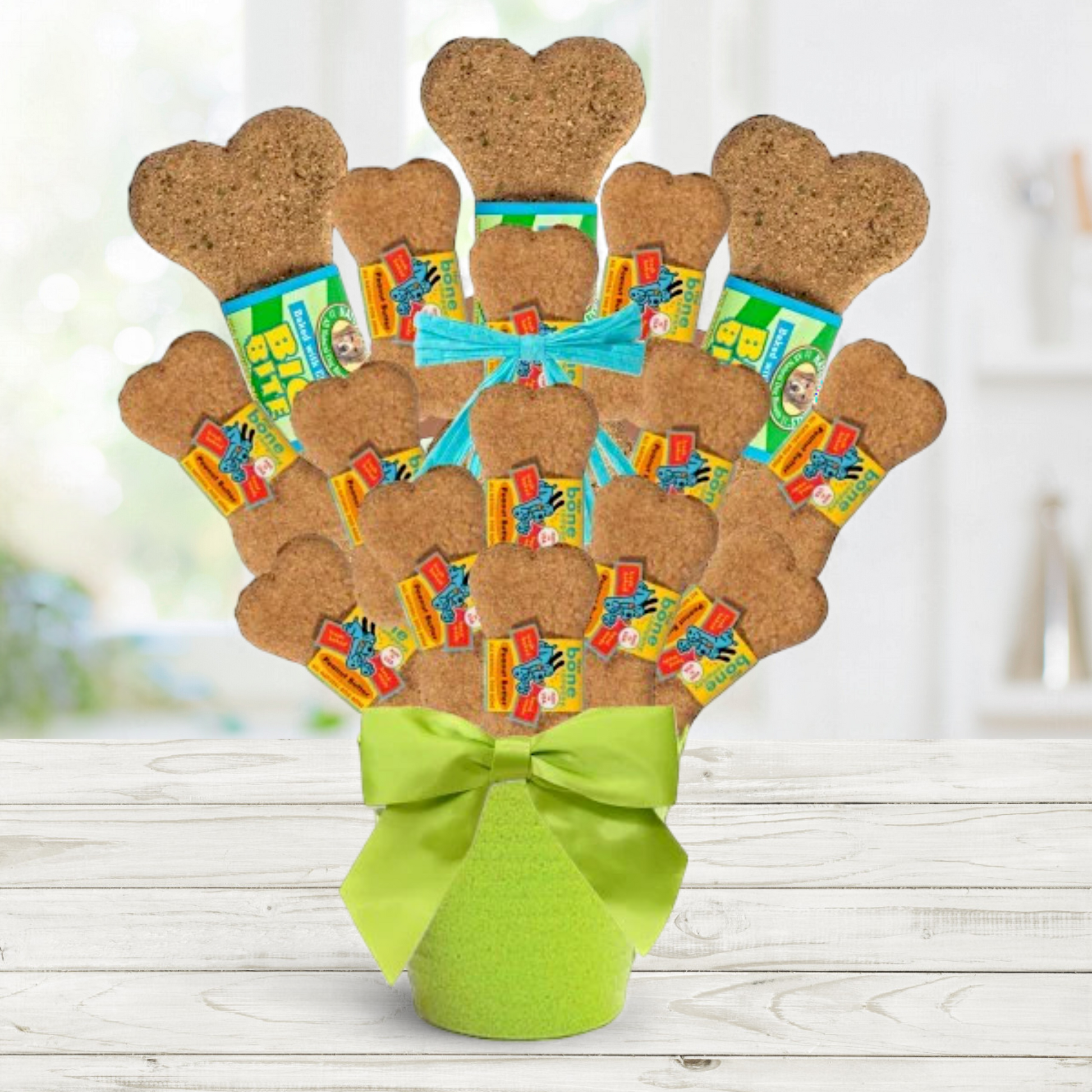 Delight your furry friend with our Bountiful Buscuits! Dog Gift Basket, featuring SIXTEEN scrumptious, crunchy biscuits arranged like a stunning floral display. Perfect for any occasion, this unique gift is sure to warm the hearts of both dogs and their owners. Celebrate Fido's achievements or simply treat them to something special with this pawfectly designed bouquet!