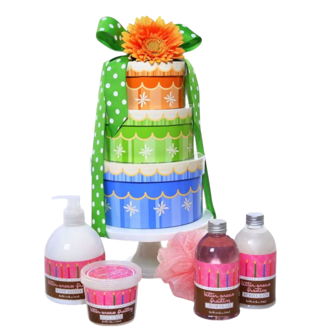 The Buttercream Spa Bath & Body Gift Tower includes:
