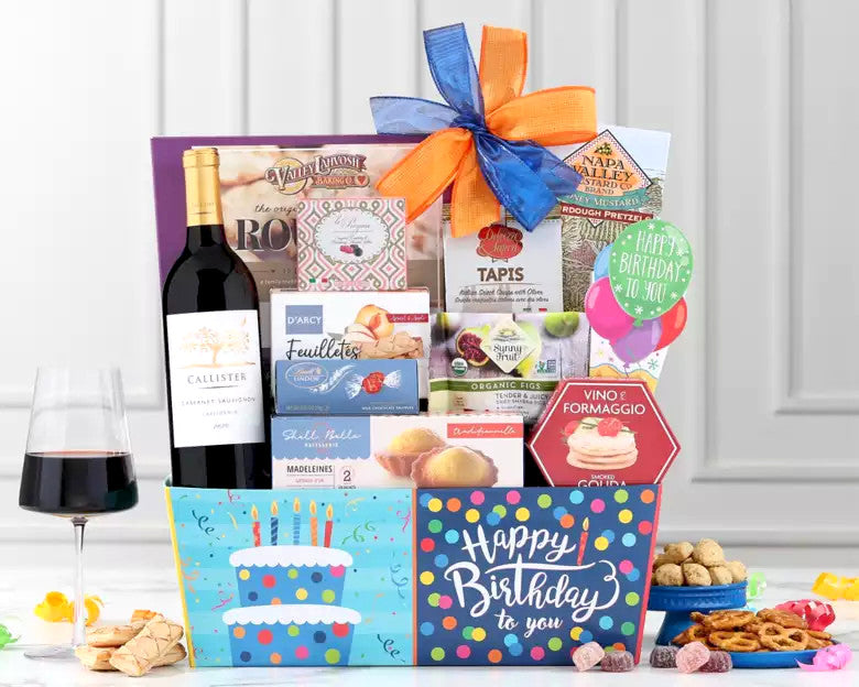 Celebrate their special day with our exquisite birthday basket, featuring a bottle of Callister Cellars cabernet alongside a selection of indulgent treats. They'll delight in Lindt milk chocolate truffles, savory sesame crackers, creamy smoked Gouda cheese spread, organic dried figs, and more. This thoughtfully curated collection is designed to create unforgettable birthday memories. Perfect for any wine and gourmet food lover.