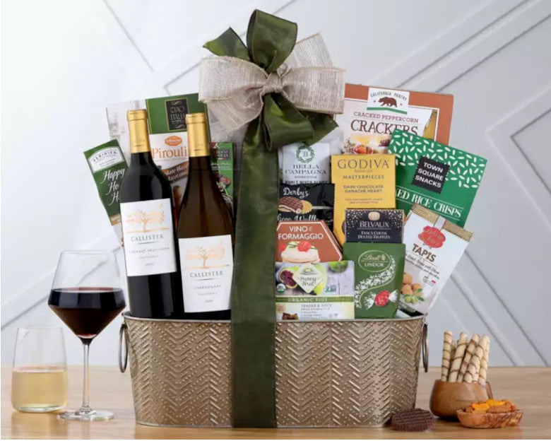 This ultimate wine gift features two exquisite Callister Cellars California wines: a rich, fruity Cabernet and a creamy Chardonnay with delightful apple and citrus notes. This luxurious set is complemented by a gourmet selection, including Lindt truffles, organic dried figs, smoked Gouda cheese spread, and more. Perfect for any occasion, elevate your gifting experience with this exceptional pairing of flavors.