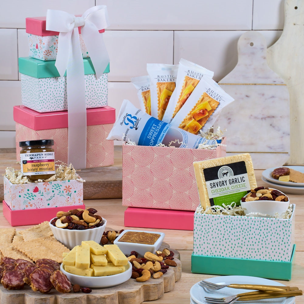 Our Celebration! Charcuterie Gift Tower arrives filled with gourmet snacks to create a grazing board for them to enjoy. This gift includes raspberry honey mustard, hot pepper jelly, two blocks of cheese, crackers, summer sausage, and more! Make someone's birthday or another special occasion noteworthy with this beautiful charcuterie gift tower.