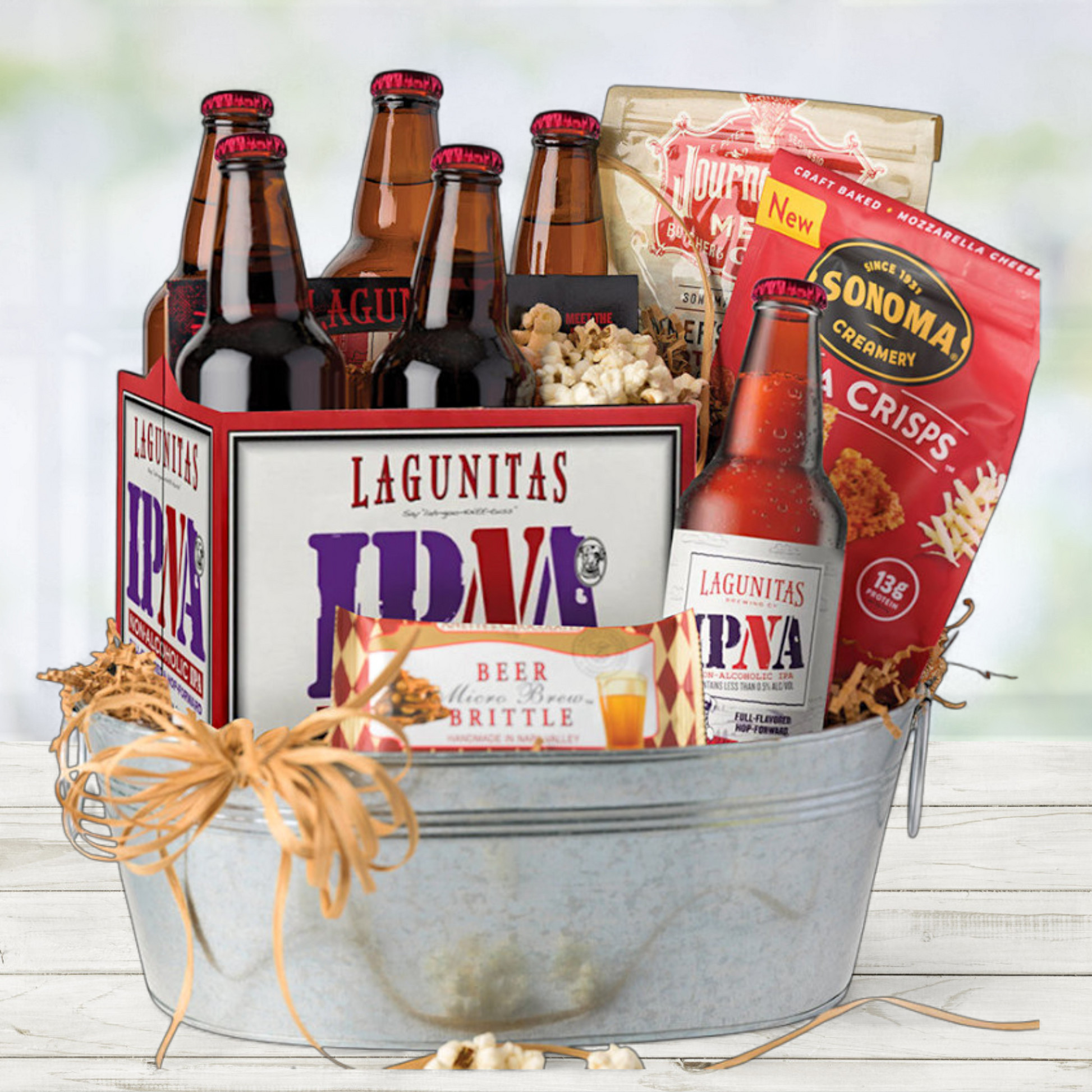 There is nothing like giving the gift of an ice-cold Lagunitas IPA, paired with some delicious snacks like beer brittle, Sonoma pizza crisps, popcorn, and beef jerky. Send some love for every taste, and watch your friend and family make the most cheerful memories together with this alcohol-free beer gift.