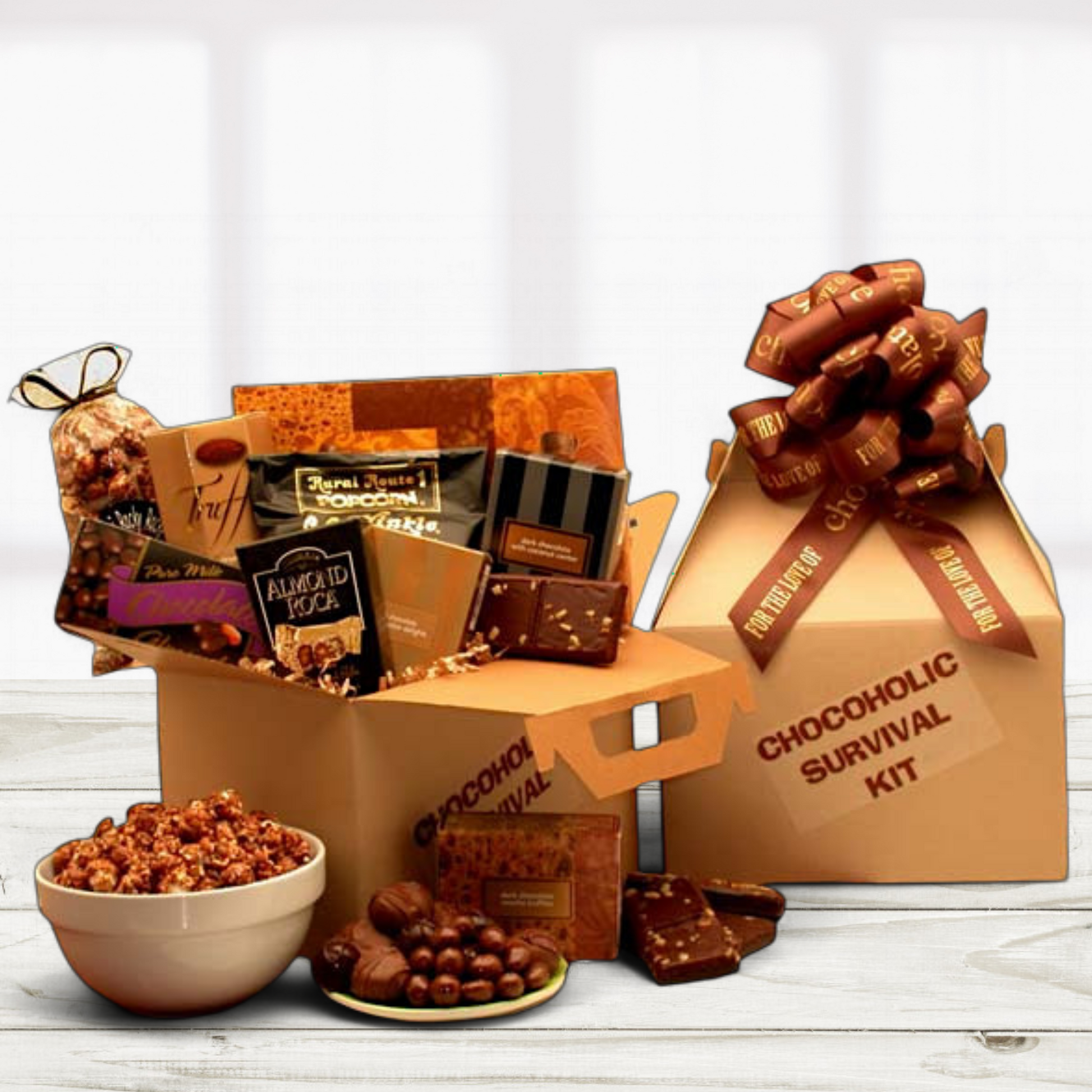 Chocolate, chocolate and more chocolate! Every chocolate lover needs this kit to survive! This awesome chocolate care package is filled to the brim with delectable chocolates, caramel clusters, brownies and more. What a treat!