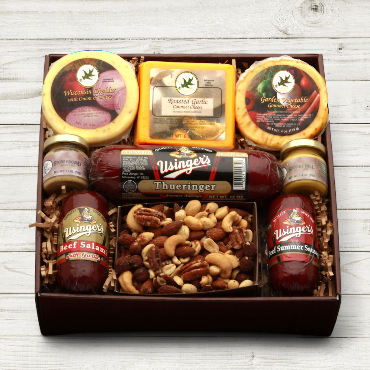 Indulge in the Choice Selections Meat & Cheese Sampler, featuring premium beef salami, summer sausage, and savory cheese rounds. Enhanced by aromatic dill and robust stone ground mustards, this gift box also includes deluxe mixed nuts for a satisfying crunch. Perfect for celebrations, client appreciation, or special treats, it offers a delightful array of flavors in every bite!