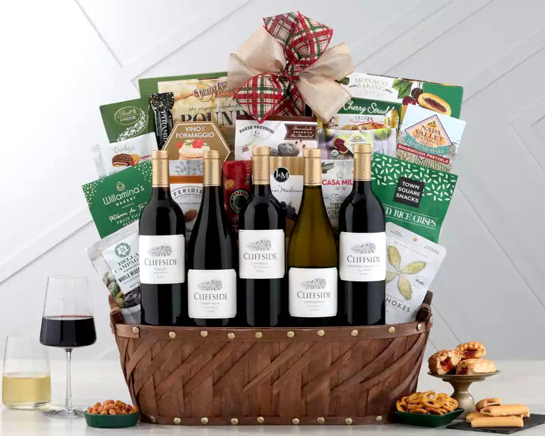 Elevate their gatherings with the Cliffside Vineyards Gift Set, featuring five exquisite wines: Cabernet, Chardonnay, Pinot Noir, Merlot, and Zinfandel. This impressive assortment is complemented by a gourmet selection of treats, including sesame crackers, honey mustard sourdough pretzels, smoked Gouda cheese spread, decadent brownies, Lindt milk chocolate truffles, and more. Perfect for any occasion, this gift ensures delightful pairings for every palate.