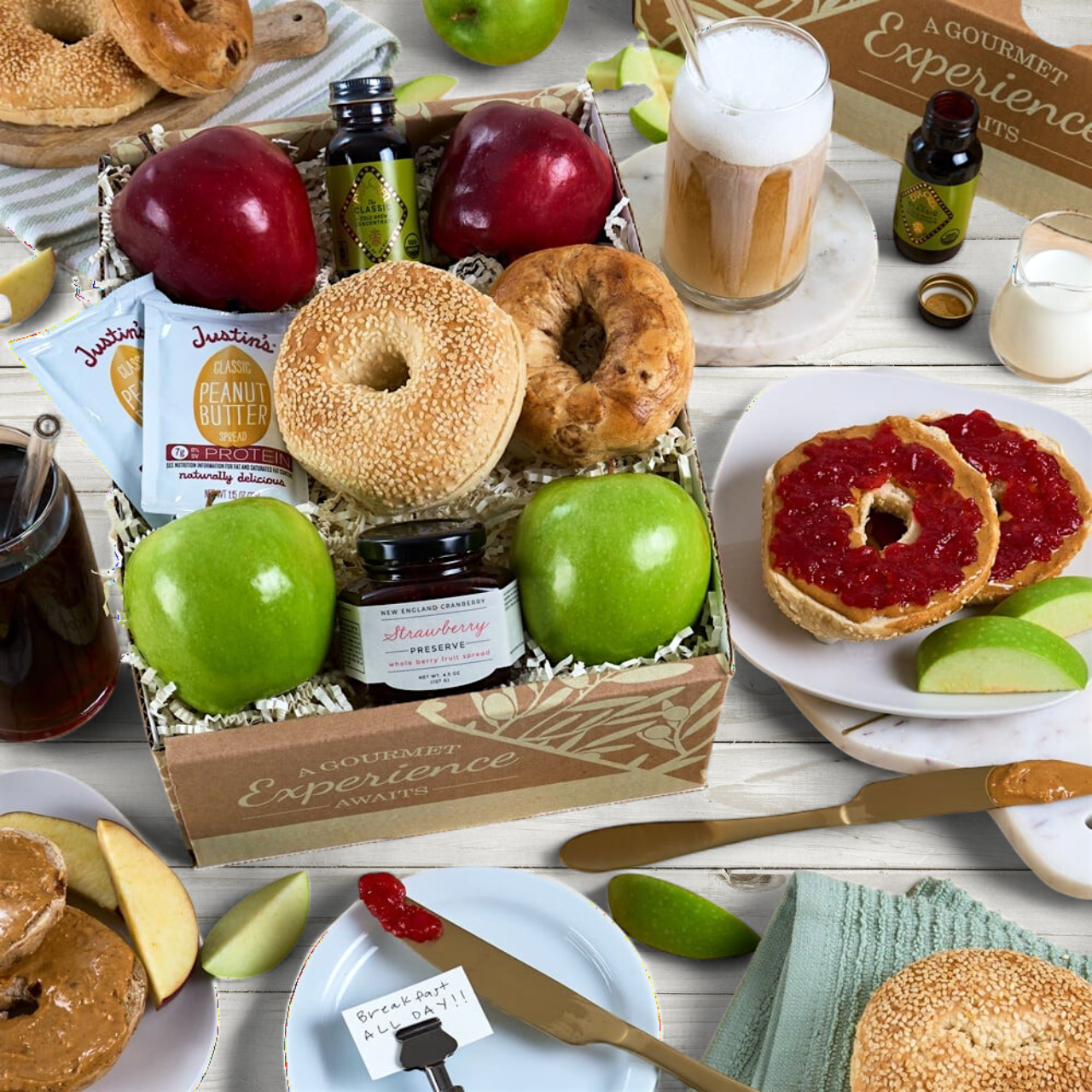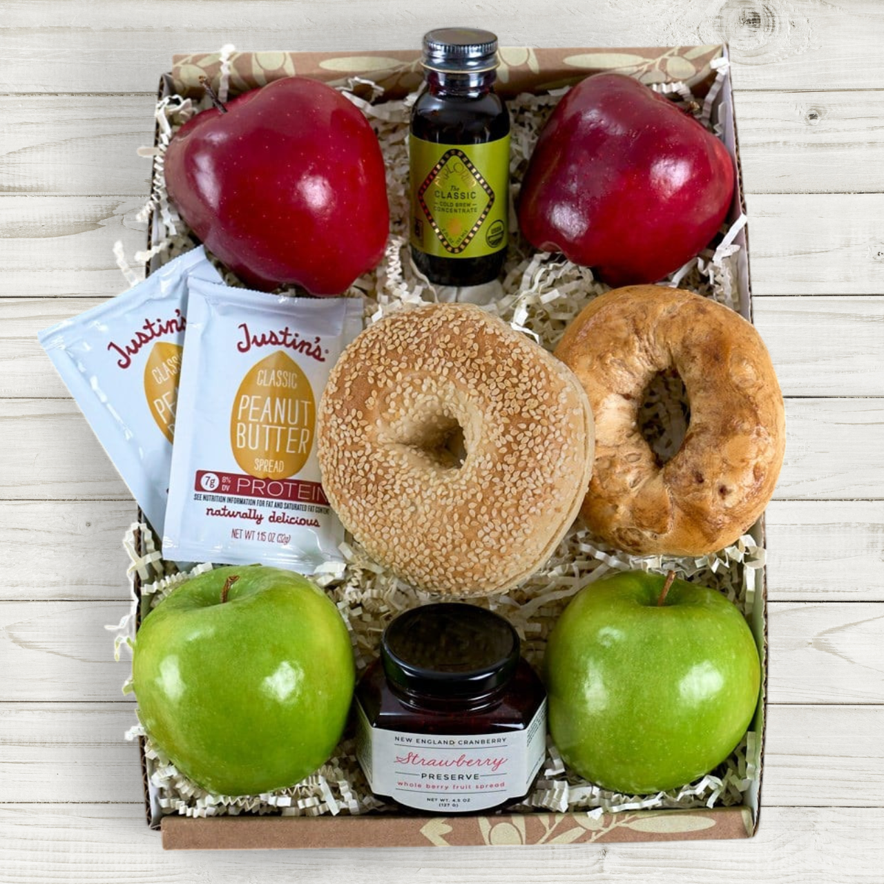 Treat them to a gourmet continental breakfast that will make them feel like they're on a luxurious vacation! Arrives with two kinds of bagels - crispy on the outside and chewy on the inside - along with sweet strawberry preserves or savory peanut butter. Crispy and juicy apples are perfect for a refreshing treat, and to top it all off, you can indulge in a rich and flavorful cold brew concentrate. A delicious gourmet breakfast gift for a lasting impression.