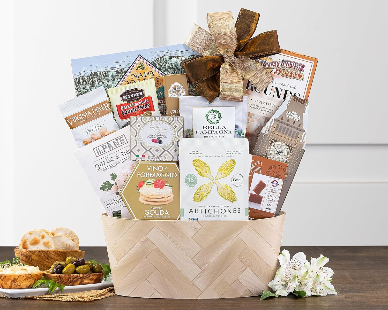 Our Deepest Condolences Sympathy Gift Basket sends an expression of your deepest sympathy to help brighten their day. A very elegant sympathy gift arrives with Lemon cakes, smoked Gouda cheese spread, Lindt Lindor milk chocolate truffle balls, vanilla fudge with sea salt, Bella Campagna mixed olives, Derby's strawberry flavored choco waffle, baked crackers and more will help convey your well wishes.