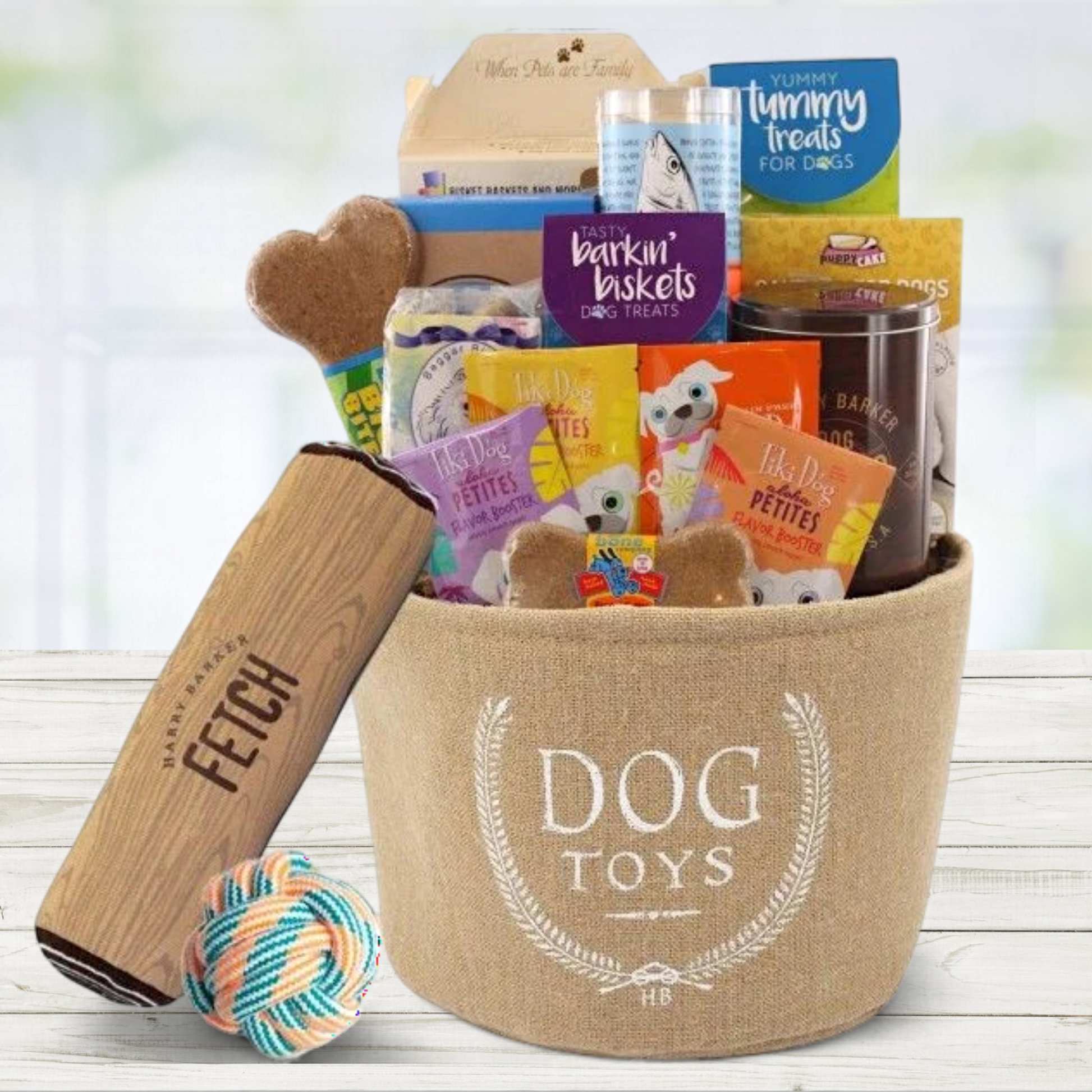 The Deluxe Dog Toy Basket with Dog Toys and Treats includes: