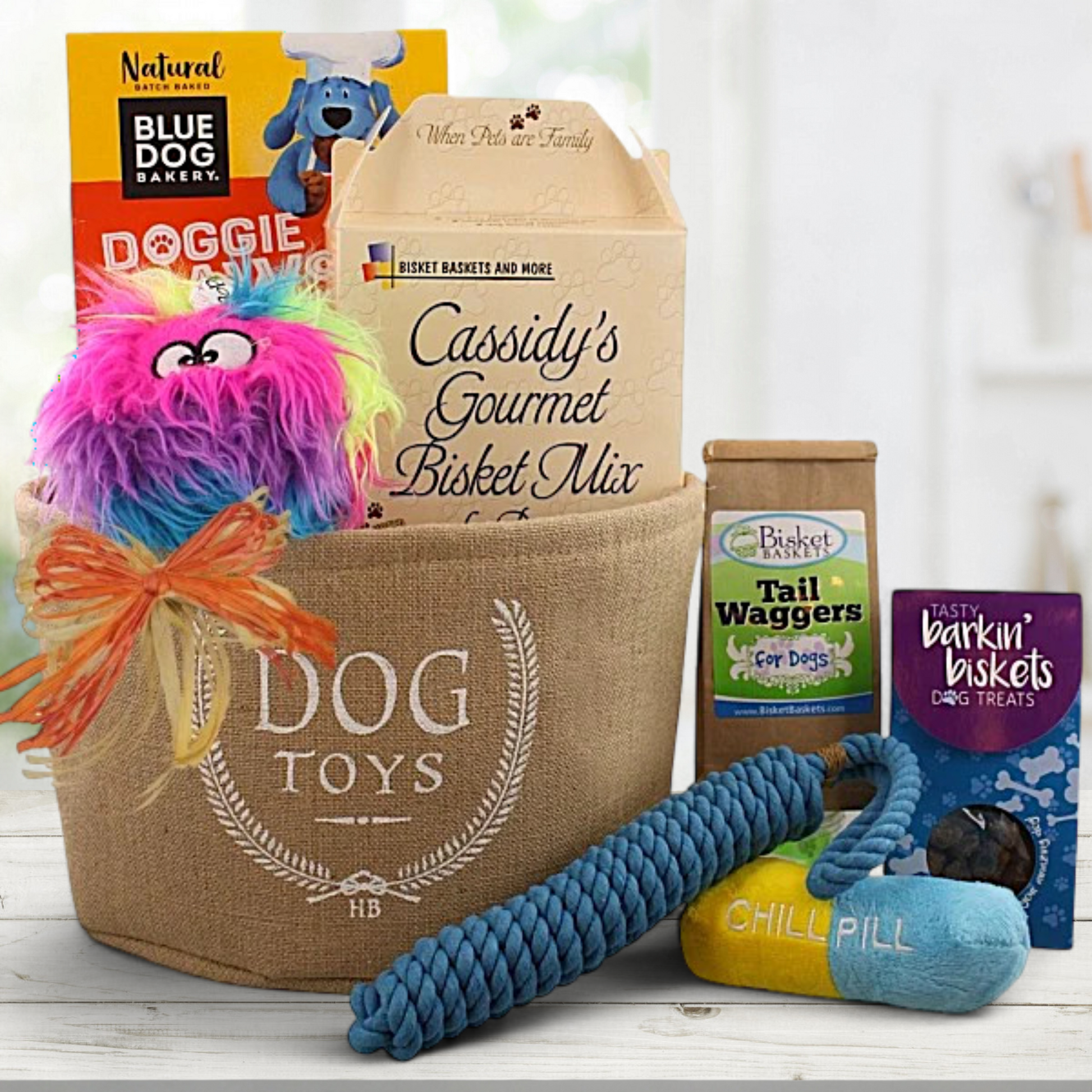 The Dog Toy Basket with Dog Toys and Treats includes: