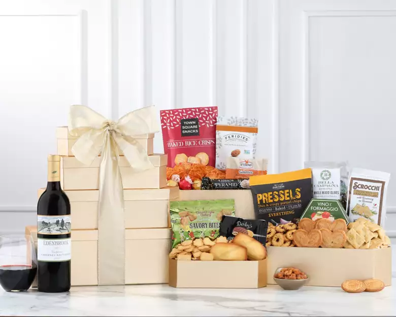 This ultimate wine gift tower, features a delightful selection of gourmet snacks paired with Edenbrook fruity Cabernet Sauvignon. This elegant collection includes mixed olives, sea salt English fudge, chocolate hazelnut wafer cookies, savory crackers, decadent chocolate brownies, and more. Perfect for any occasion, this gift is sure to impress and satisfy every palate.