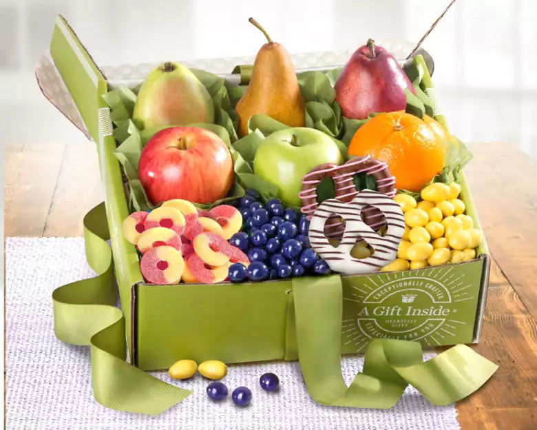 Experience the essence of summer with our delightful fruit gift box. Featuring a selection of fresh seasonal fruits, including D'Anjou and Crimson Red pears, Braeburn and Granny Smith apples, and a juicy Navel orange. This gift is complemented by chocolate-dipped pretzels, lemon crème almonds, and chocolate-covered blueberries. Elegantly packaged and tied with a colorful bow, it’s a healthy and thoughtful gift perfect for any occasion.