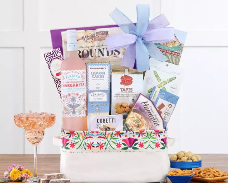 Indulge them with our refreshing Flybird Watermelon Cucumber Margarita Cocktail gift crafted with 100% de agave wine, sweet watermelon, cool cucumber, and zesty lime juice—just add ice for a perfect sip! This delightful gift basket also features savory Hummus, Poshi rosemary and oregano asparagus snacks, spicy honey crunch mix, fruity jelly candies, and decadent Lindt Lindor truffles for a complete treat.