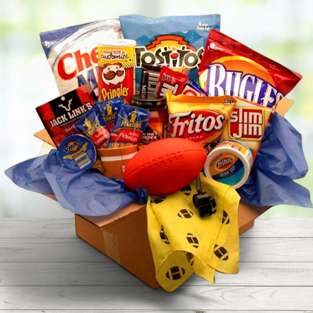 This fun football themed gift includes a festive yellow foul flag, Nerf football, referee whistle, and an abundance of game time snacks. Our Game Day Football Snack Care Package will be the hit of the day!