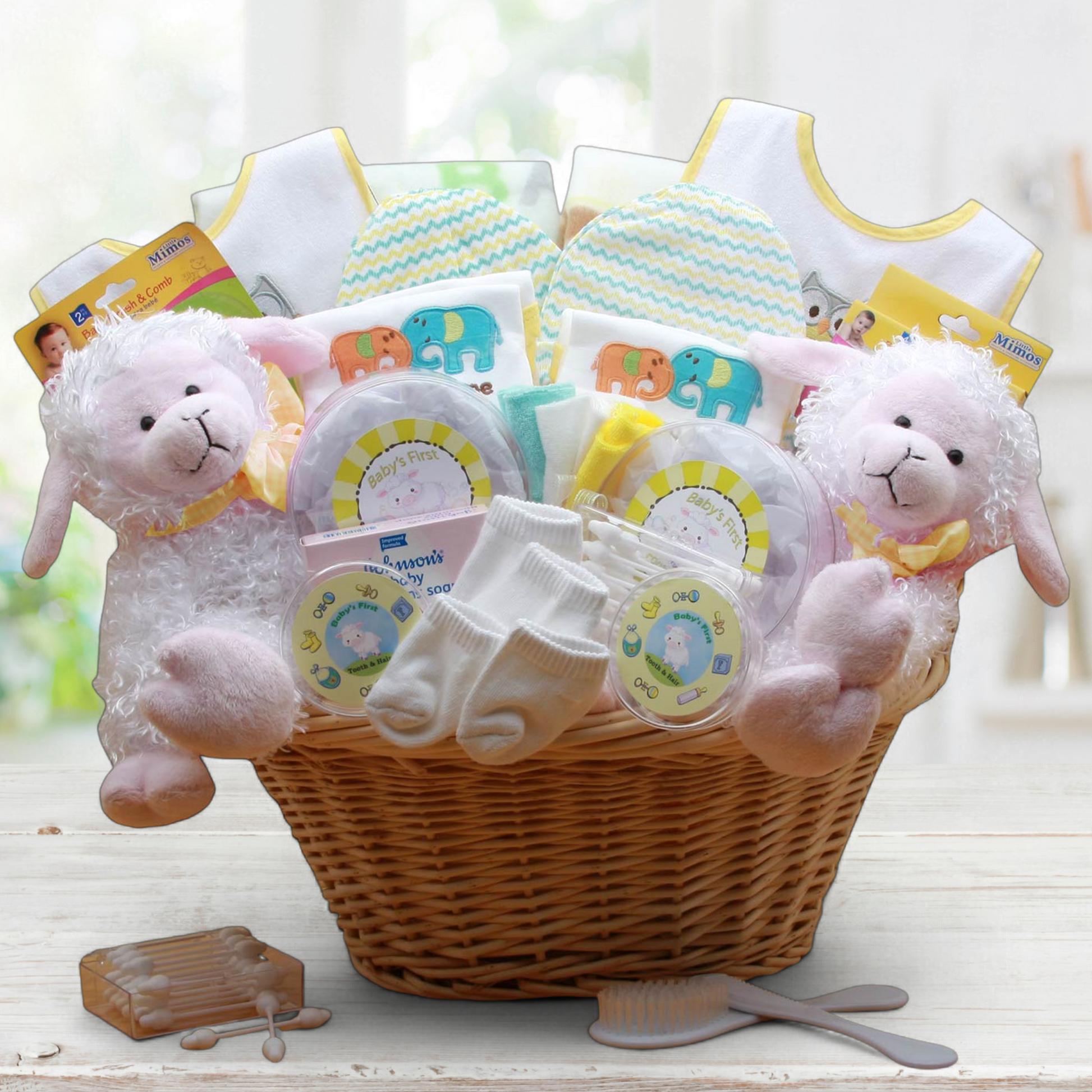 Our For the Love of Twins Baby Gift Basket is overflowing with baby necessities times two. Inside they'll find baby bibs, booties, blankets, baby beanies and much more. The adorable soft plush lambs are anxiously awaiting to meet their new best friends!