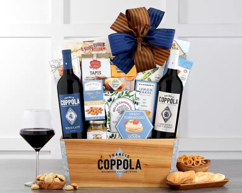 Indulge in the exquisite Wine Gift featuring a pair of Francis Ford Coppola California wines from the prestigious Diamond Collection. This handmade basket includes a rich Cabernet and Merlot, complemented by gourmet snacks such as smoked Gouda cheese spread, mixed olives, fruit jellies, lemon cakes, and vanilla fudge. Perfect for any occasion, this unique gift promises a delightful tasting experience.
