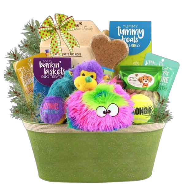 What a delicious and fun holiday dog gift to send to your favorite canine friends! Filled to overflowing this holiday gift has two things inside; biscuits and toys! Funky toys in funky colors! Let them run fetch and chew their way through this delightful dog gift and let them celebrate the holidays with this aptly named gift Funtastic Holiday Christmas Dog Gift!