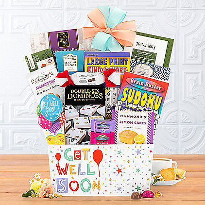 Brighten their day with this comforting selection. They'll enjoy chicken and rice soup, green tea, cookies and sweets while a Dominoes set, Find a Word and Sudoku puzzle books help them pass the time as they enjoy sampling this thoughtful collection.