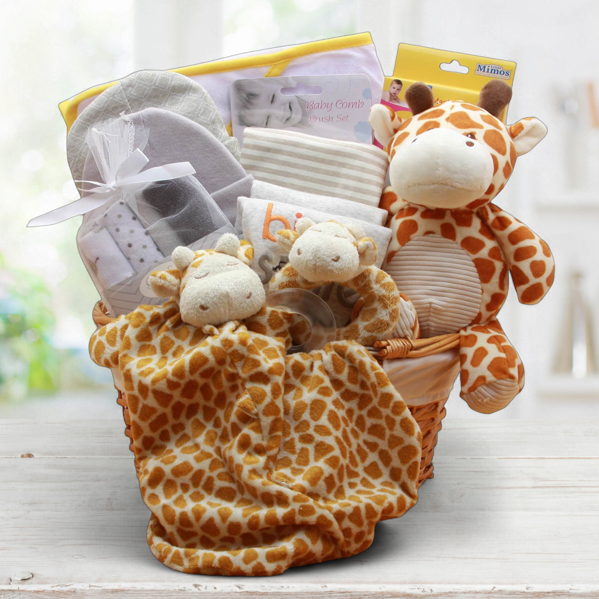 The Giraffe Safari Baby Gift Basket arrives with an array of baby necessities in a keepsake fabric lined basket that is perfect for storing baby essentials. This gift also includes ultra soft keepsake Giraffe security blanket soon to become the new babies most treasured belonging. Very cute and unique!