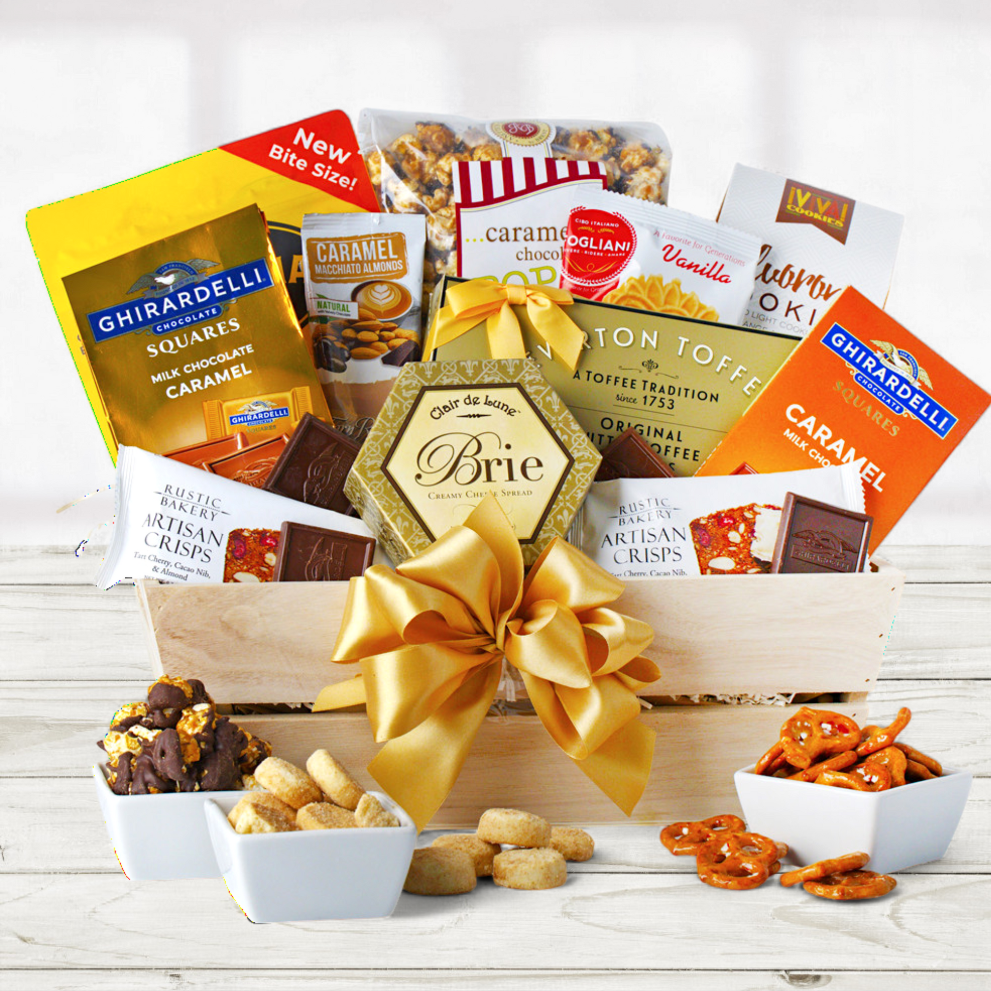 They'll indulge in the ultimate snacking experience with this exquisite collection featuring a delightful assortment of treats. The Golden Sweet & Savory Gourmet Snack gift arrives with rich Ghirardelli chocolate squares, irresistible caramel chocolate popcorn, creamy cheese spread paired with artisan crisps, and more. Delightful for any occasion, this thoughtfully curated gift basket is sure to satisfy both sweet and savory cravings.