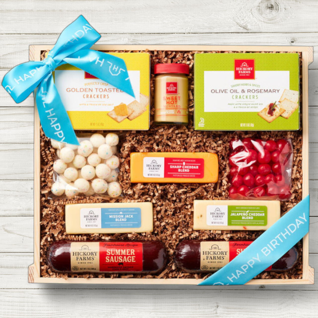 Celebrate in style with the Gourmet Happy Birthday Gift Crate, featuring premium Farmhouse Summer Sausage and three unique cheese blends: Sharp Cheddar, Mission Jack, and zesty Jalapeño Cheddar. Enjoy Golden Toasted and Olive Oil & Rosemary Crackers, complemented by Sweet Hot Mustard for a flavorful kick. Finish with festive Confetti Cake Bites and tangy Cherry Sours for a delightful birthday treat!