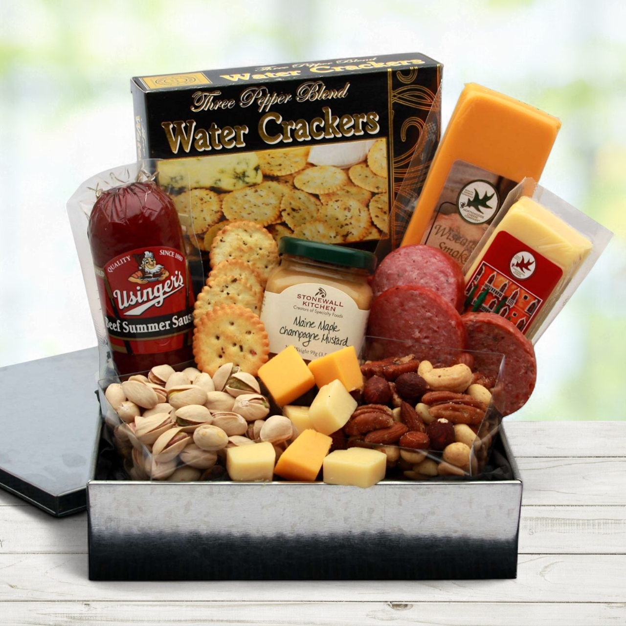 Indulge in the Gourmet Sausage Cheese Charcuterie Gift Tin, a luxurious assortment of savory summer sausage, artisanal cheeses, and three pepper blend water crackers. Enhanced by Maine Maple Champagne Mustard, this elegant tin also includes roasted pistachios and pecans, offering a delightful mix of flavors and textures. Perfect for entertaining or gifting, elevate any occasion with this exquisite selection.