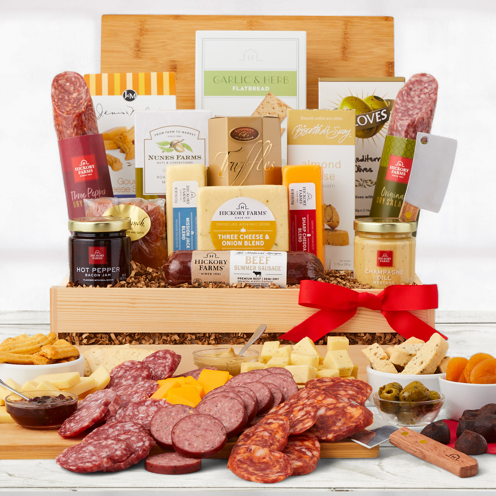 Elevate your gifting with the Grande Meat & Cheese Gift Crate, featuring all-natural summer sausage, two dry salami varieties, and three exquisite cheese blends. Accompanied by gourmet Champagne Dill Mustard, Hot Pepper Bacon Jam, and crispy Garlic & Herb Flatbread, this collection also includes sweet treats like French Truffles and Turkish apricots. Perfect for any special occasion, it comes with a bamboo cutting board and cleaver for effortless serving.