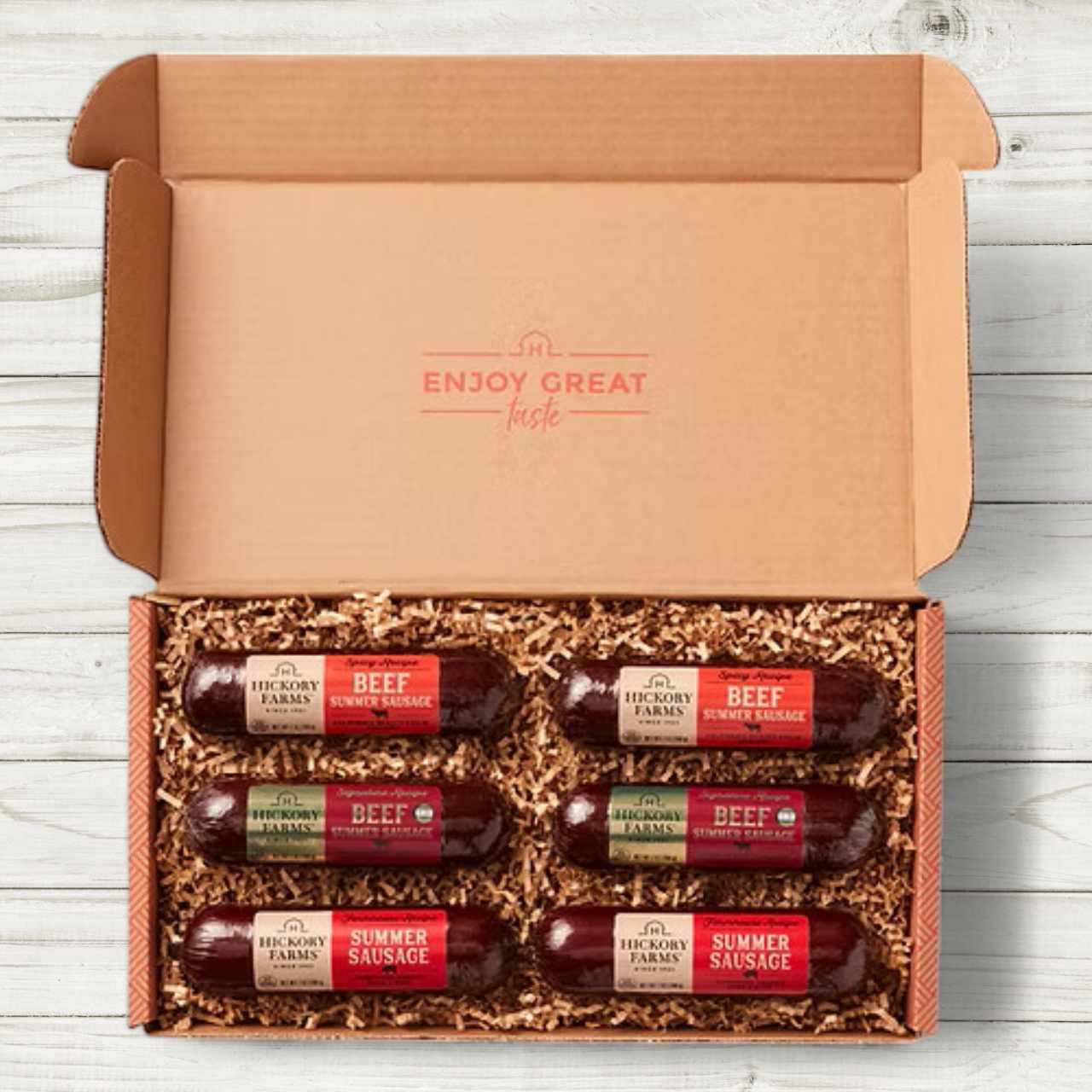 Experience the ultimate flavor with Hickory Farms' premium summer sausage collection. This curated set includes six sausages—two each of the Classic, Signature Beef, Zesty, Spicy Beef, and Hearty Farmhouse varieties. Perfect for entertaining or gifting, each sausage offers a unique taste that will elevate any occasion.