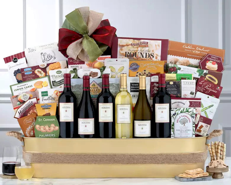 This impressive wine gift collection features award-winning Napa Valley wines, including pinot noir, cabernet, merlot, chardonnay, red blend, and sauvignon blanc. This exquisite assortment is beautifully complemented by a selection of Ghirardelli dark chocolate, lemon cakes, fruit jellies, sesame crackers, cheese spread, Lindt milk chocolate truffles, and more. A perfect choice for any connoisseur or special occasion.