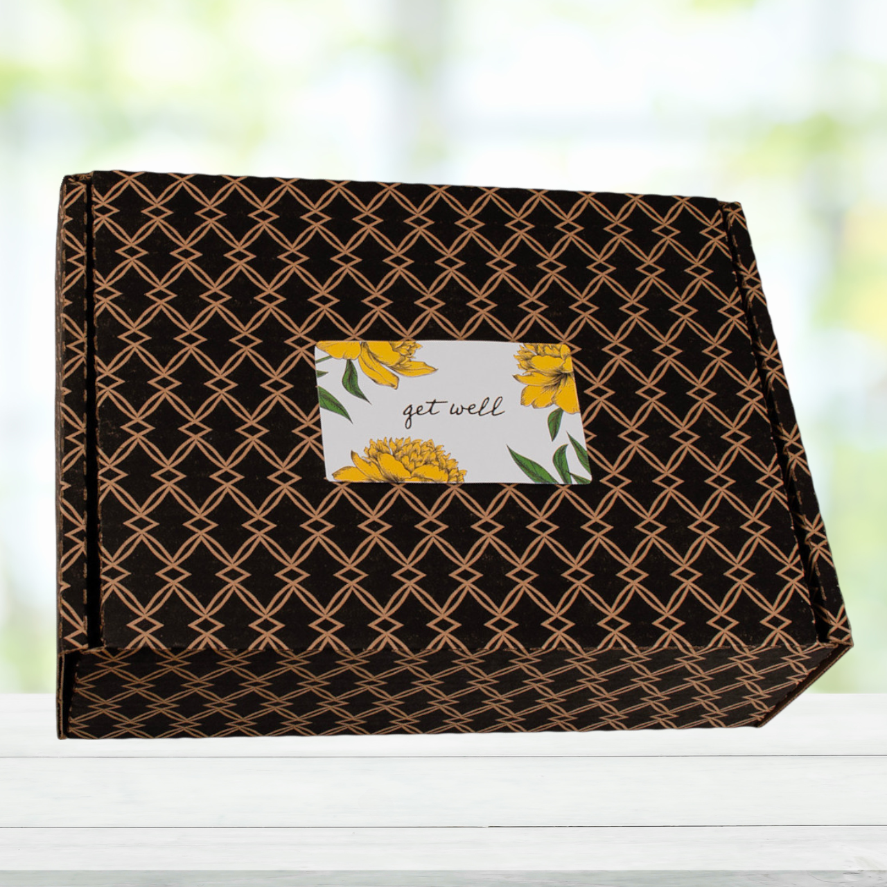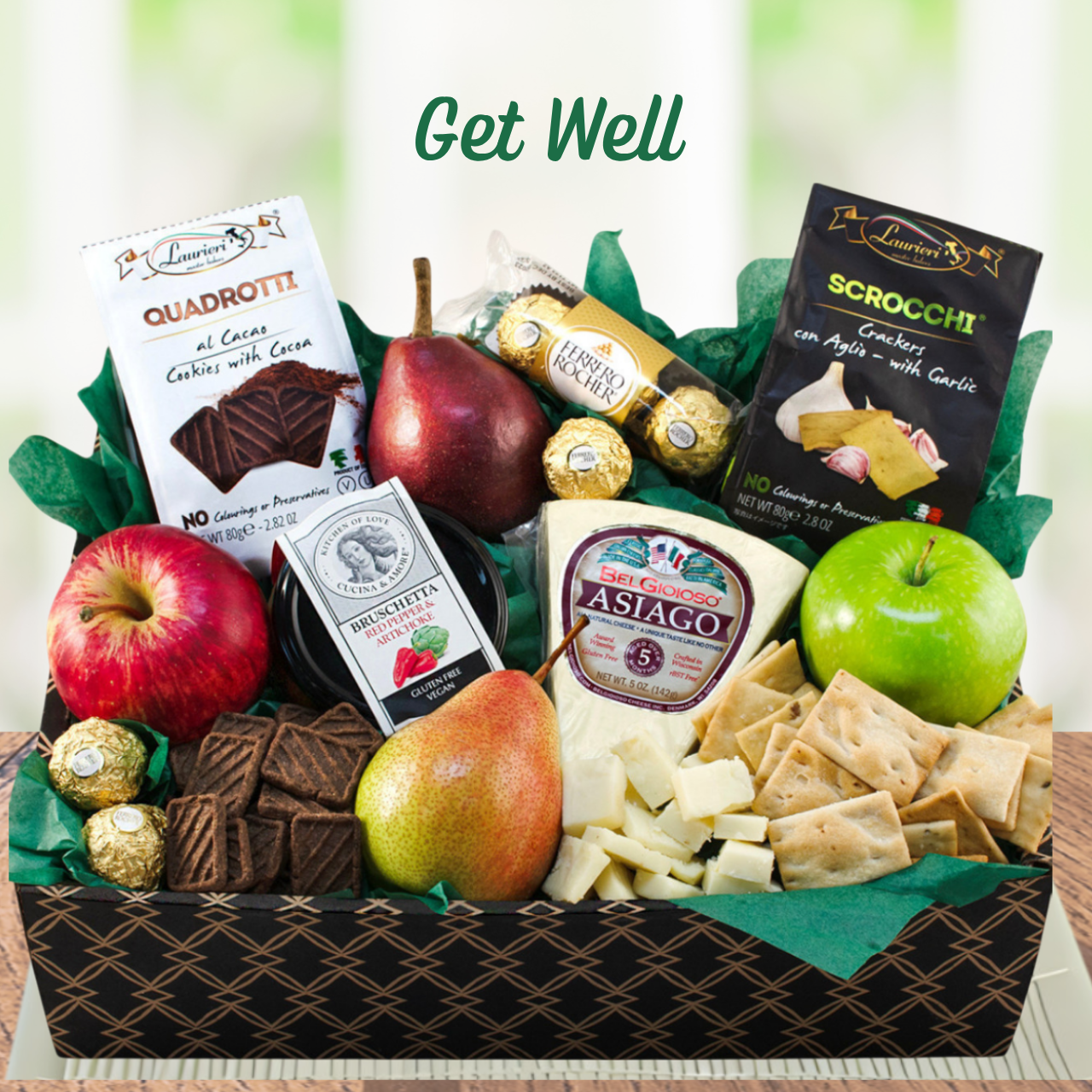 Brighten someone's day with our thoughtful get well arrangement, beautifully presented in a decorative gift box. This delightful selection includes four pieces of farm-fresh fruit, Asiago cheese, Scrocchi garlic crackers, piquillo & artichoke bruschetta, Ferrero Rocher chocolates, and Quadrotti biscuits. Perfect for sending warm wishes and comfort during recovery.
