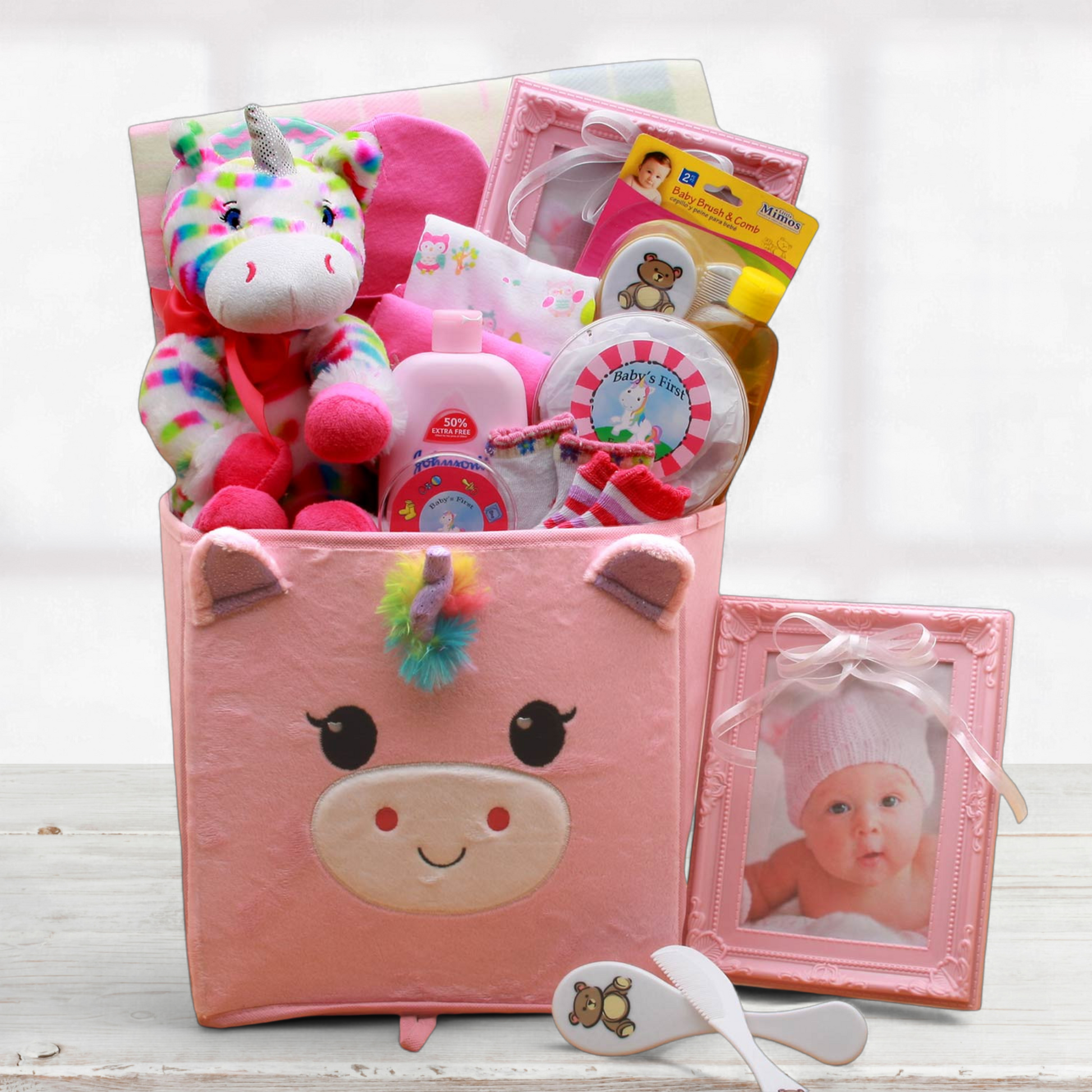 Welcome the sweet bundle of joy home with our adorable Little Darling Unicorn Baby Gift Basket. With her rainbow bright fur, the ultra soft unicorn will soon become the new little bundles most treasured friend. Arrives in a keepsake collapsible unicorn storage bin to hold all her favorite toys as the years go by.
