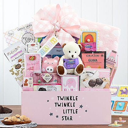 The Little Princess Baby Girl Gift Basket arrives overflowing with a pink and white soft baby blanket, cuddly bear, piggy bank, snacks, cookies and so much more, this gift is a wonderful way to welcome everyone home.