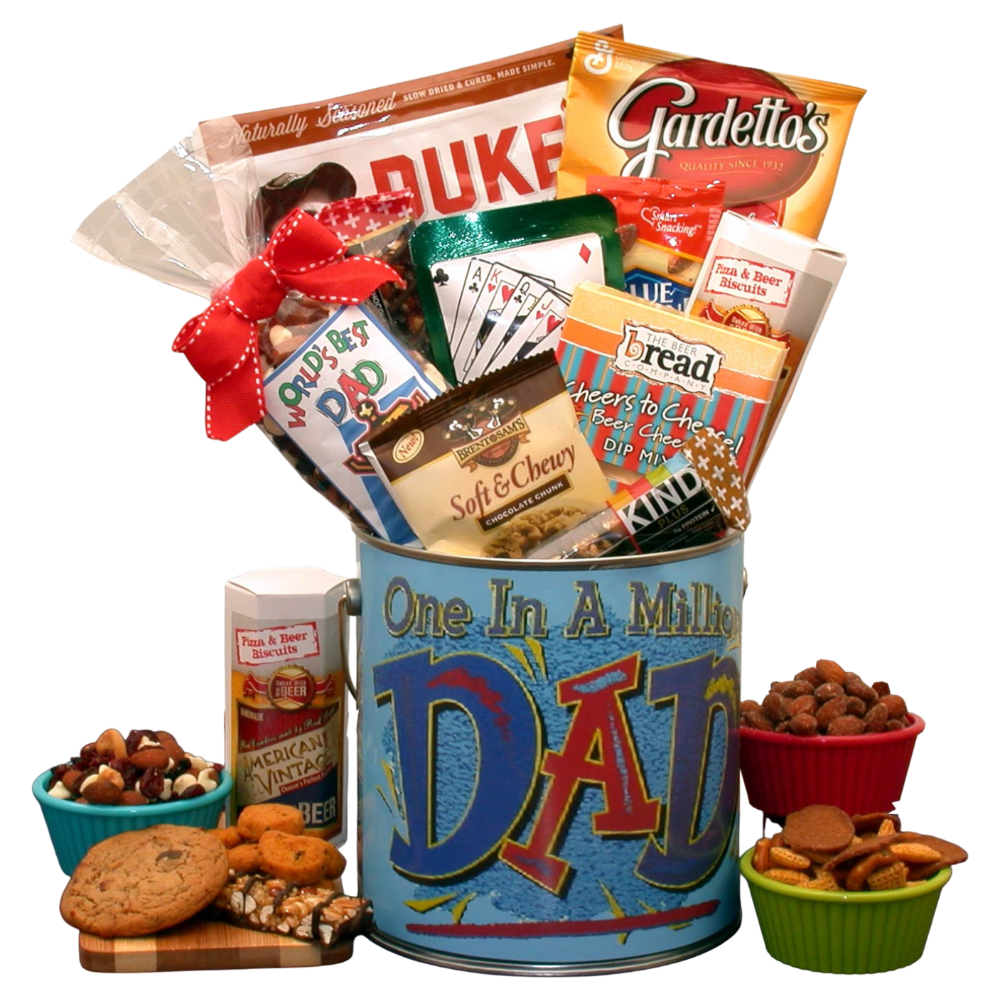 Celebrate your dad with the One In A Million Dad Father's Day gift! This curated collection features Brent & Sam's chewy chocolate chip cookies, savory summer sausage, and a variety of snacks like Blue Diamond smoked almonds and Gardetto's mix. Complete with gourmet coffee and a delicious cheese dip, this gift is perfect for indulging his taste buds and showing appreciation. Make this Father's Day unforgettable!