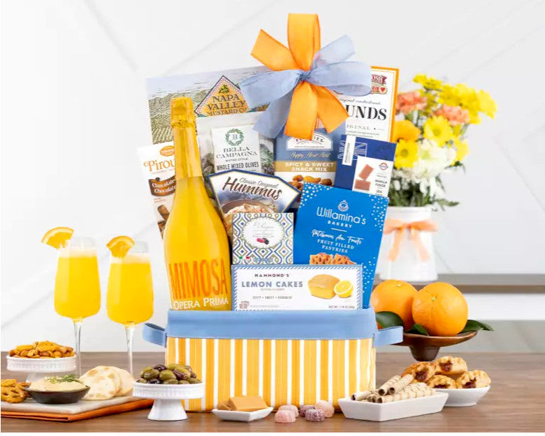 This exquisite Opera Prima Spanish mimosa, is a delightful blend of sparkling wine and fresh-squeezed orange juice. This luxurious Mediterranean cocktail gift basket features an array of gourmet treats, including lemon cakes, sesame crackers, hummus, olives, chocolate hazelnut wafers, and more. Perfect for celebrations or as a thoughtful gift, elevate any occasion with this elegant selection.