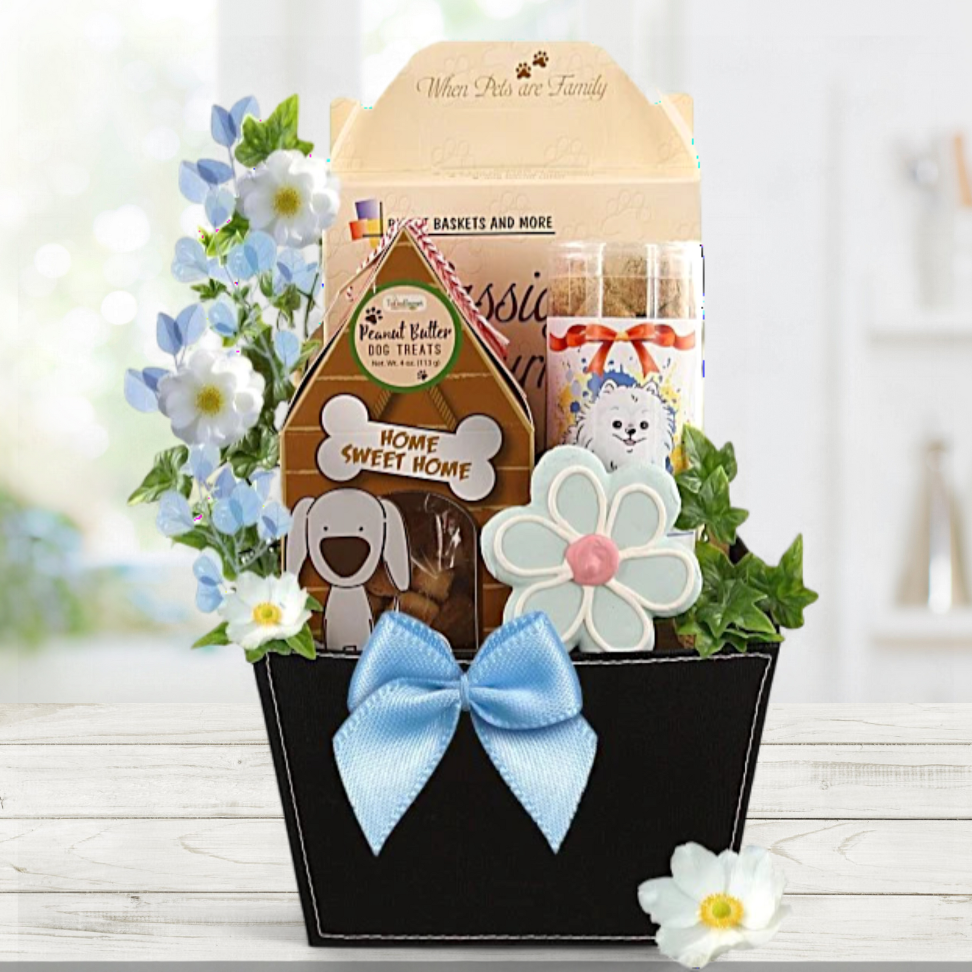 Celebrate every day with our Pampered Pup Dog Gift Basket! Elegantly packaged in a chic faux leather tote, this delightful assortment of premium biscuits will have your furry friend wagging their tail with joy. Conveniently shipped to your door, this gift guarantees endless excitement and plenty of happy licks from Fido. Treat your dog to a taste of luxury today!