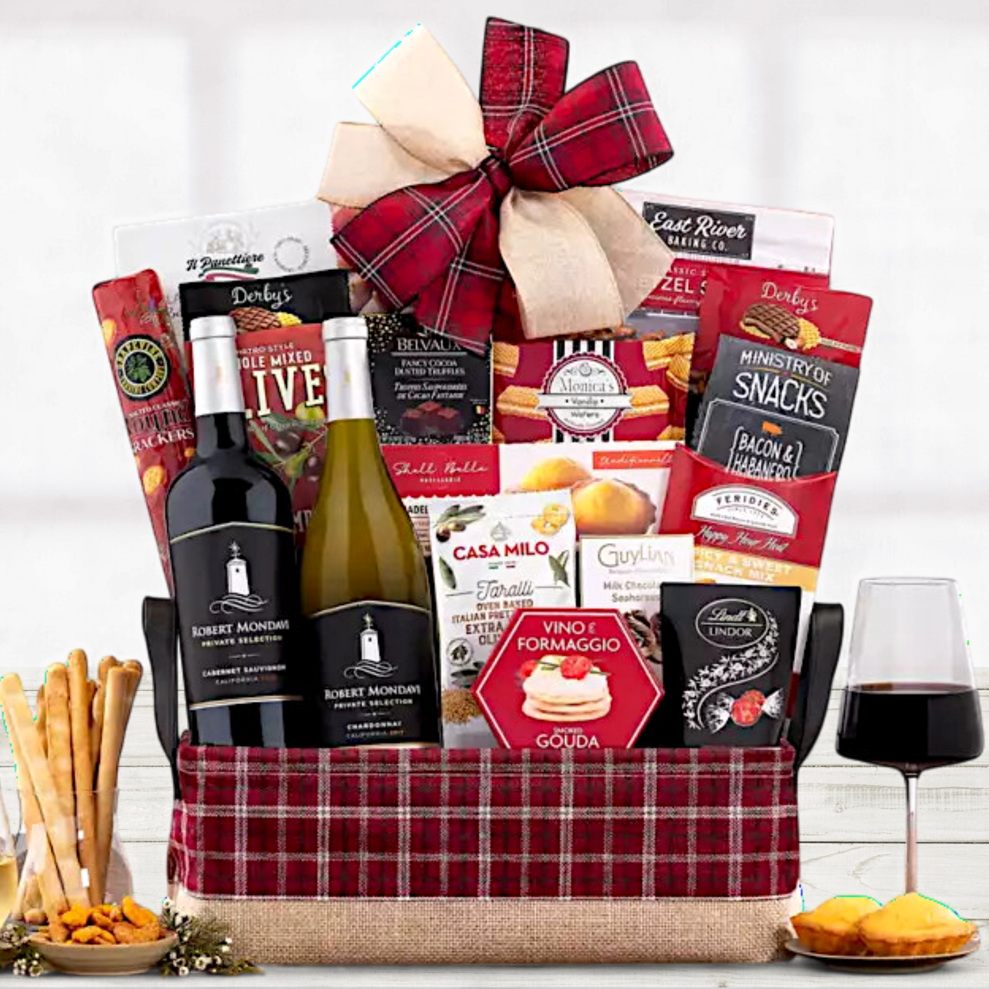 Indulge them with the ultimate wine gift basket featuring two exquisite Robert Mondavi Private Selection wines: a rich Cabernet Sauvignon and a refreshing Chardonnay. Complemented by gourmet treats like Lindt truffles, smoked Gouda cheese spread, and a variety of cookies and crackers, this basket is perfect for any occasion. Elevate your celebrations or delight a loved one with this luxurious selection.