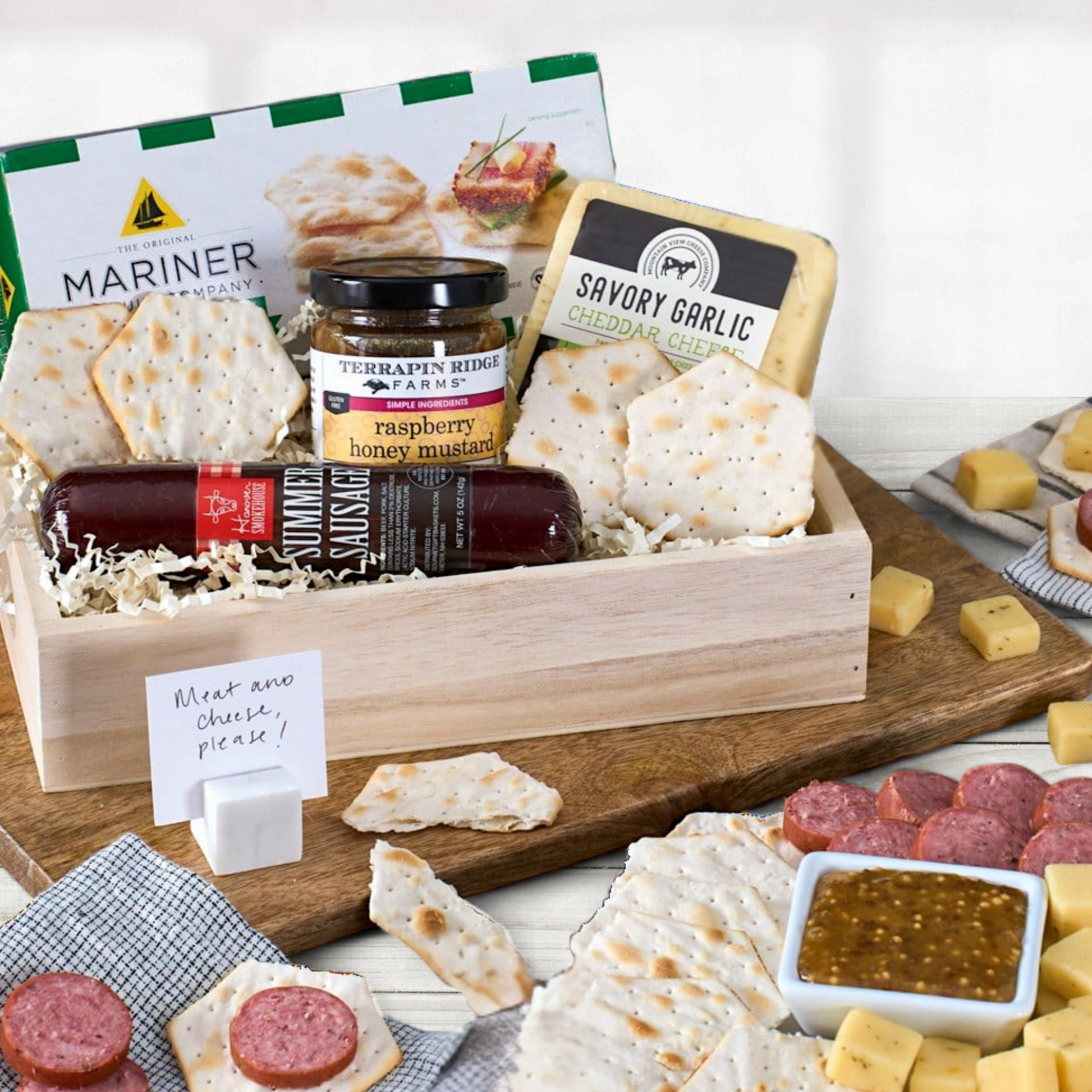The Savory Meat & Cheese Sampler arrives filled with a thoughtful selection of cheese, crackers, savory sausage, and tasty raspberry honey mustard. This delicious bite-sized gourmet gift is perfect for any occasion!