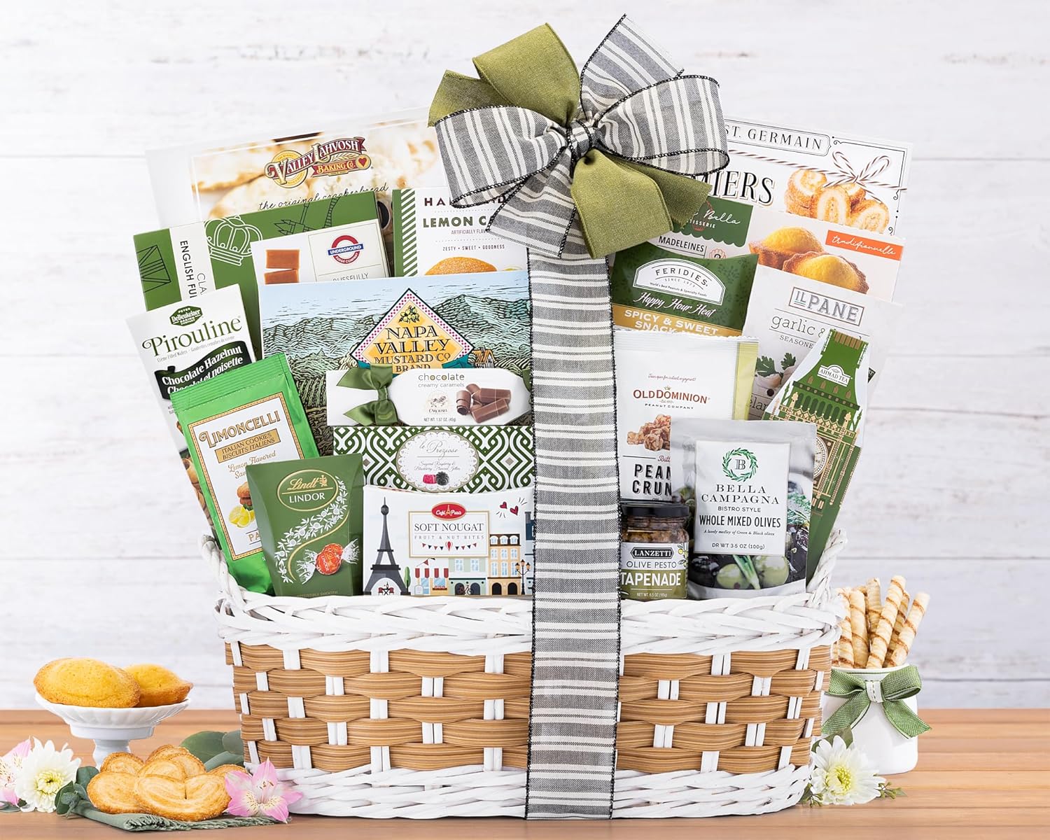 The Sincere Condolences Sympathy Gift Basket arrives with a large collection of sesame crackers, lemon cakes, English tea, vanilla fudge with sea salt, honey mustard sourdough pretzels, olive tapenade, chocolate caramels, puff pastries, chocolate brownie and so much more fills this understated basket. This gracious basket will deliver your encouragement and support.