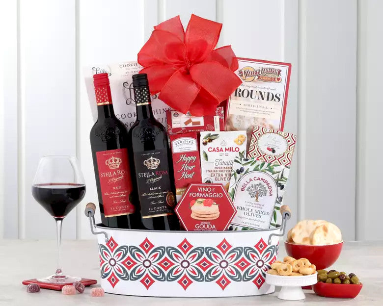 Send the ultimate wine gift basket featuring Stella Rosa's beloved semi-sweet and lightly carbonated wines: the fruity Red with sweet strawberry notes and the sultry Black, bursting with ripe blackberry, blueberry, and raspberry flavors. Complemented by Vine e Formaggio smoked Gouda cheese spread, Lille chocolate cookie thins, Feridies spicy snack mix, and Le Preziose fruit jellies, this exquisite selection is perfect for any occasion.