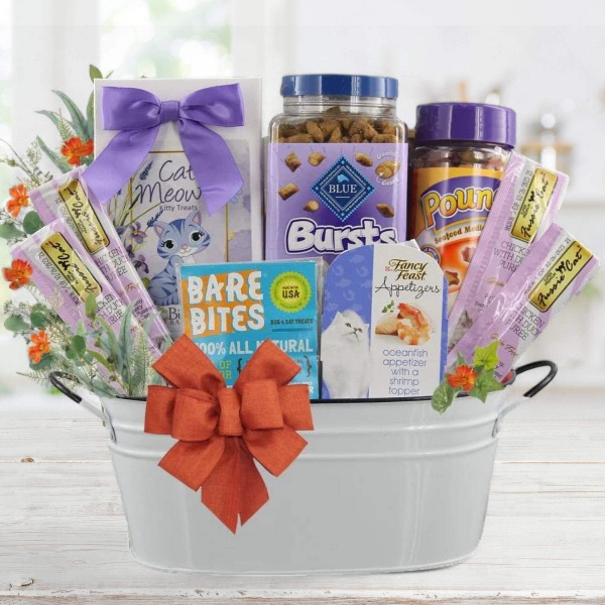 Delight your feline friend with our exciting gift basket, brimming with a variety of irresistible kitty treats and goodies. Perfect for birthdays, new adoptions, or as a heartfelt thank-you for pet sitters, this basket will have your cat purring with joy. Treat your pet and surprise their owner with this thoughtful and fun gift!