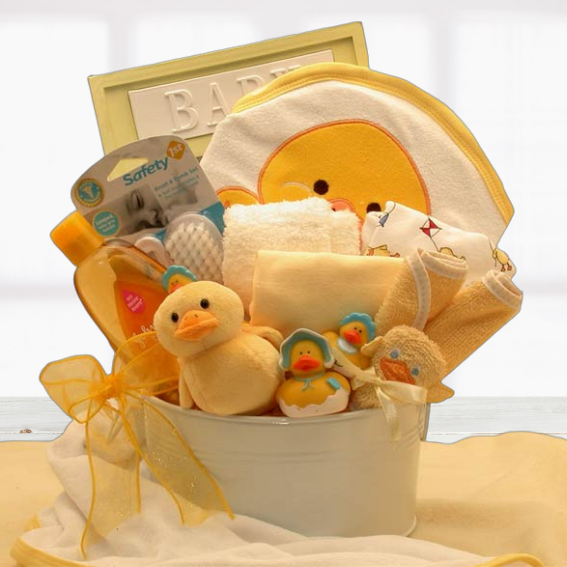 Shower them with this sweet duck themed baby bath gift set. Included with this adorable Tiny Bubbles Baby Bath Gift Set are all the essentials for baby's first bath such as baby washcloths, hooded bath towel, beanies and more. The plush mommy and baby ducks are adorable and the keepsake baby washtub can be used for years to come!