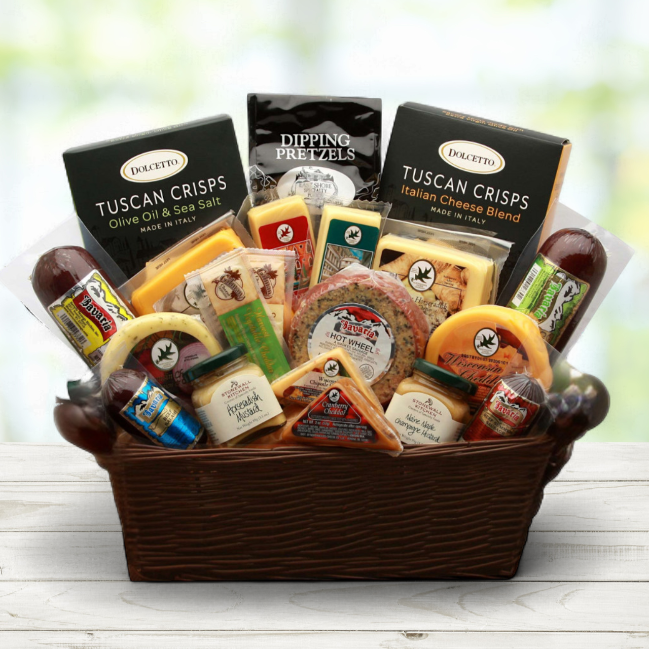 Indulge in our Ultimate Gourmet Meat & Cheese Charcuterie Gift Basket, featuring a luxurious selection of premium cheeses, artisanal crackers, and savory accompaniments. Delight in Italian-made Tuscan Crisps, gourmet dipping pretzels, and specialty mustards, all elegantly arranged to create a memorable gift for any occasion. Perfect for impressing friends, family, or clients.
