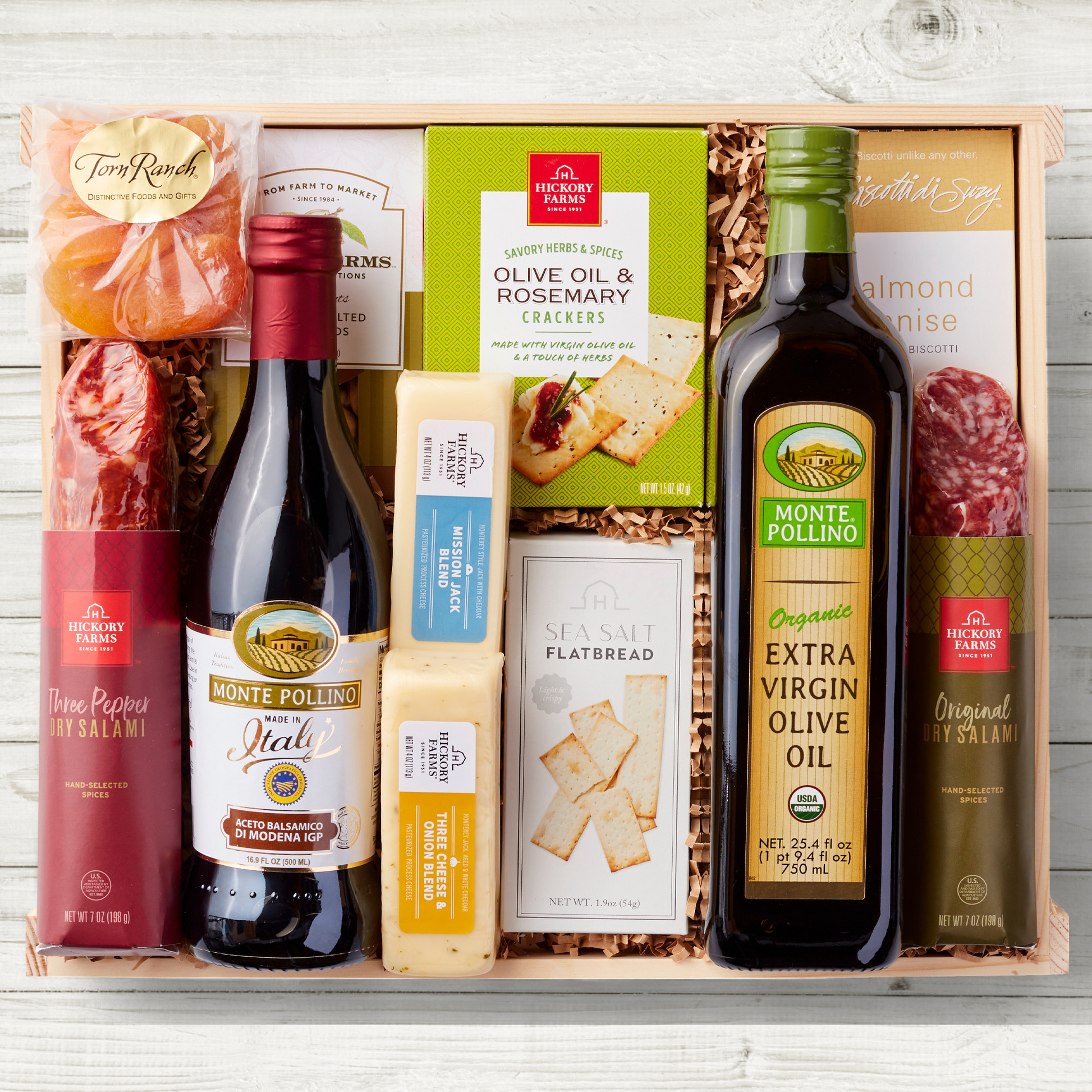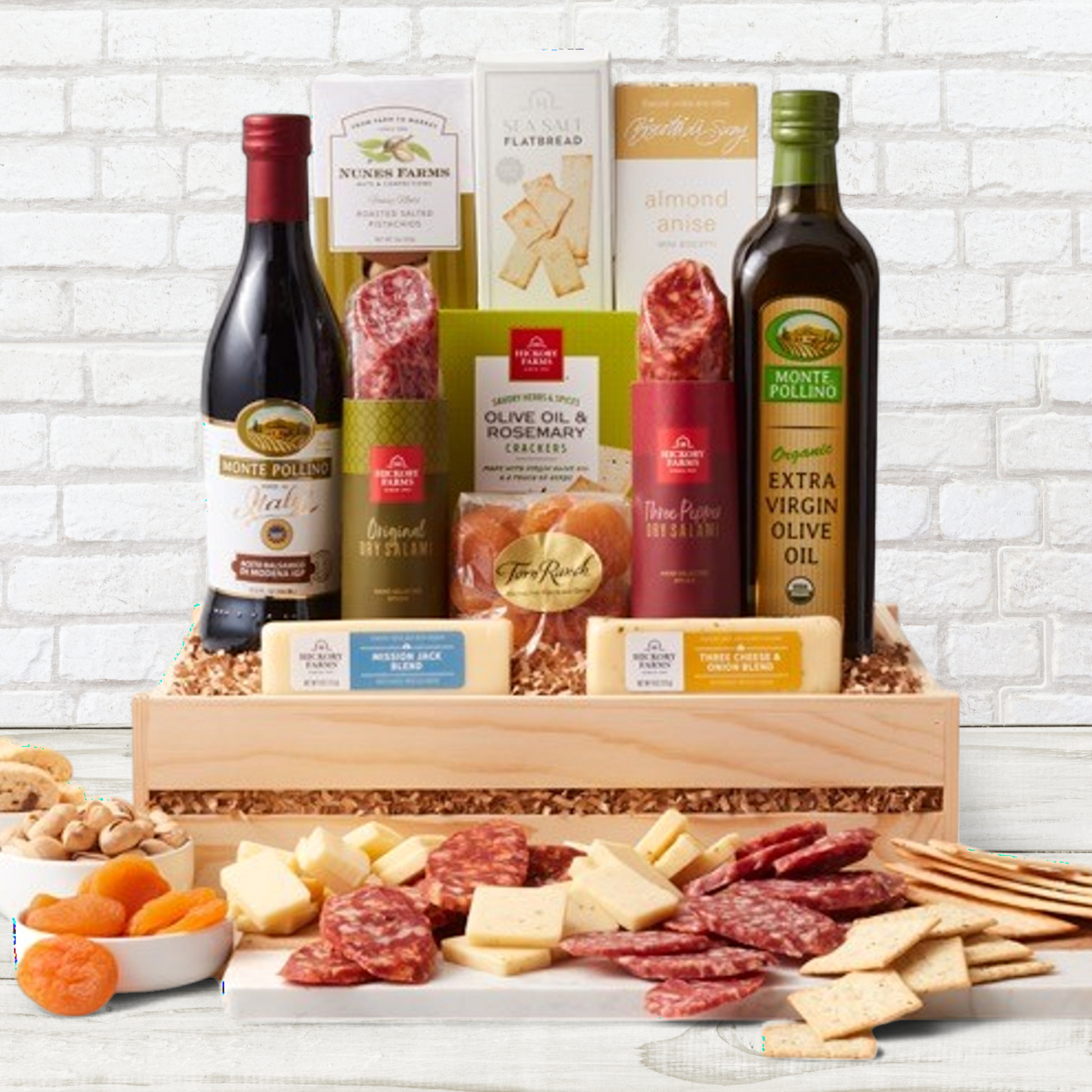 What an amazing flavor experience. Our Ultimate Gourmet Meat & Cheese Gift Crate sends a crate fully loaded with delicious flavors for a delicious charcuterie. Two varieties of salami complement the savory cheeses along with the crunch of crackers and nuts. A drizzle of vinegar and olive oil help create a variety of delicious flavor combinations. They’ll finish on a sweet note with dried fruits and biscotti.