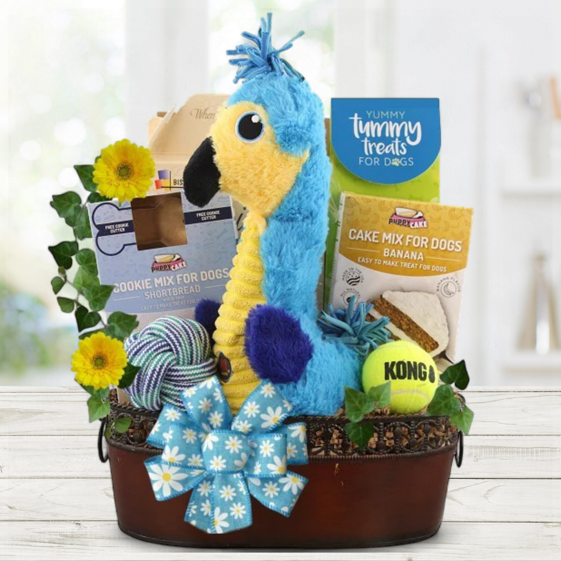 Treat your furry friend to the ultimate dog gift basket! Packed with delicious biscuits, tasty treats, and a large plush macaw toy, this delightful set comes in a beautiful reusable handled tin. Perfect for playtime or snuggling, it’s a gift that both dogs and their owners will cherish. Ideal for any special occasion!
