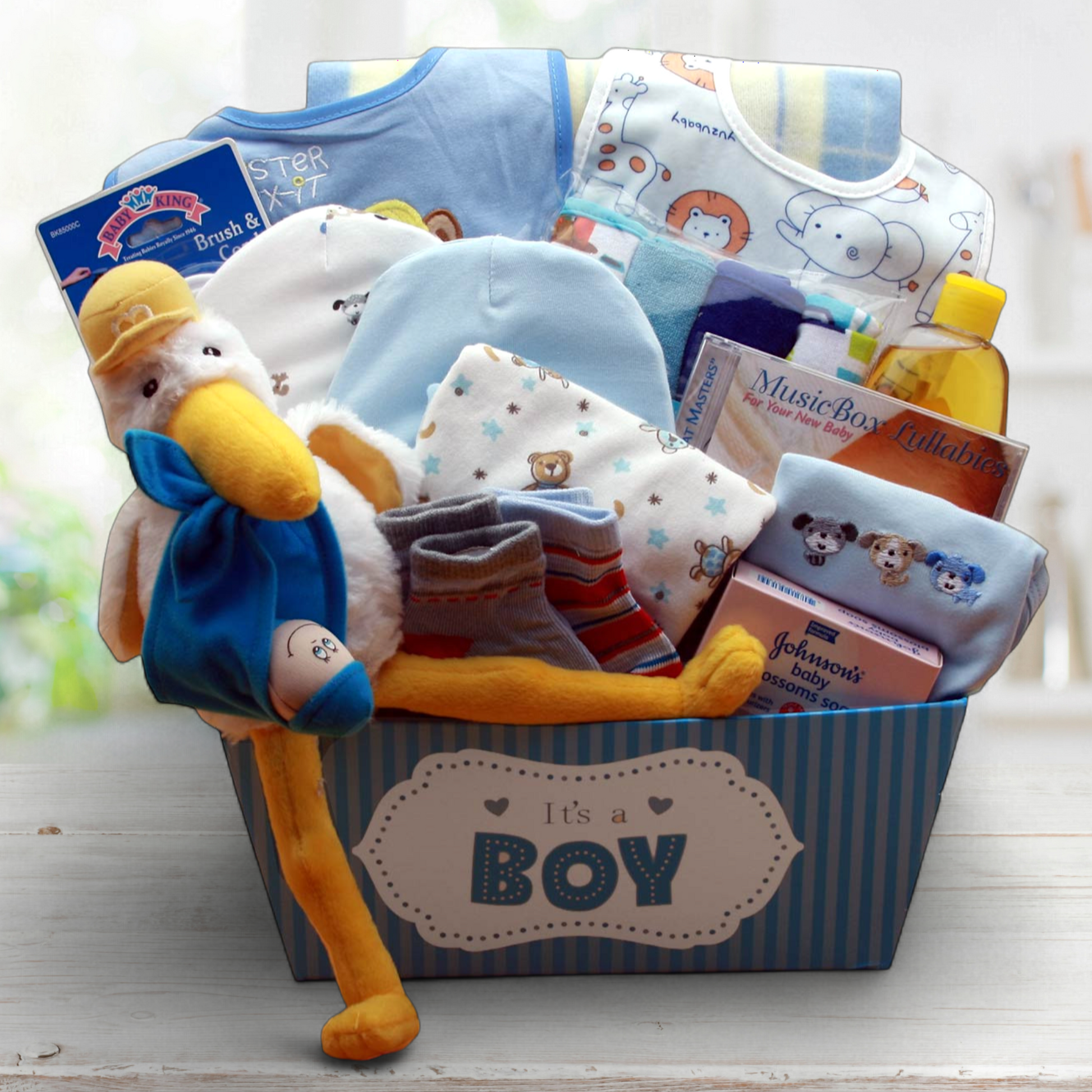 The Welcome Baby Boy Gift Basket arrives filled to the brim with an abundance of baby necessities. Inside they'll find baby booties, bibs, receiving blanket and more. The plush stork makes this gift truly unique!