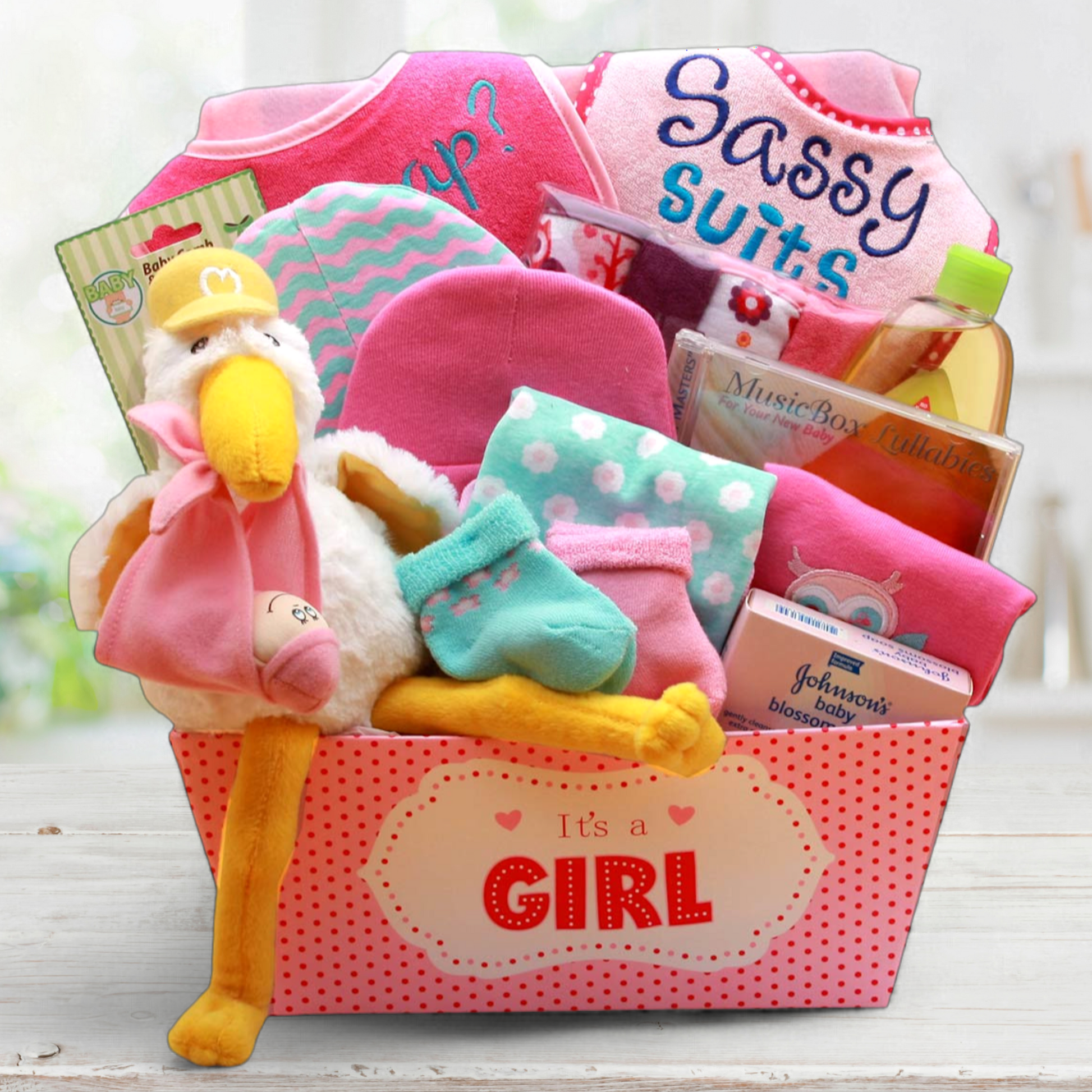 The Welcome Baby Girl Gift Basket arrives filled to the brim with an abundance of baby necessities. Inside they'll find baby booties, bibs, receiving blanket and more. The plush stork makes this gift truly unique!